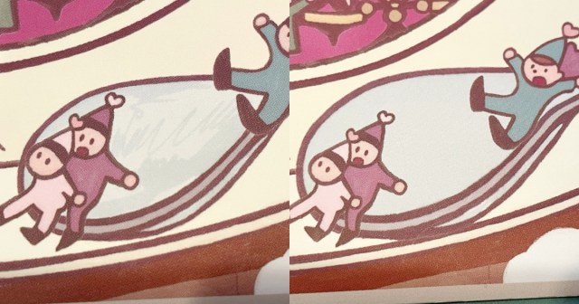 これは一体どういうことなのか? 印刷の段階で生じた汚れやエラーなのか。それともイラストレーターさんの修正漏れなのか。真相は謎のままである。