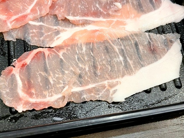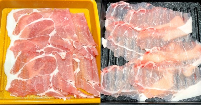 肉が乗っている皿の色に注目すると、「豚肩ロース」の皿が黄色系なのに対し、「豚ロース」の皿の色は黒だ。
