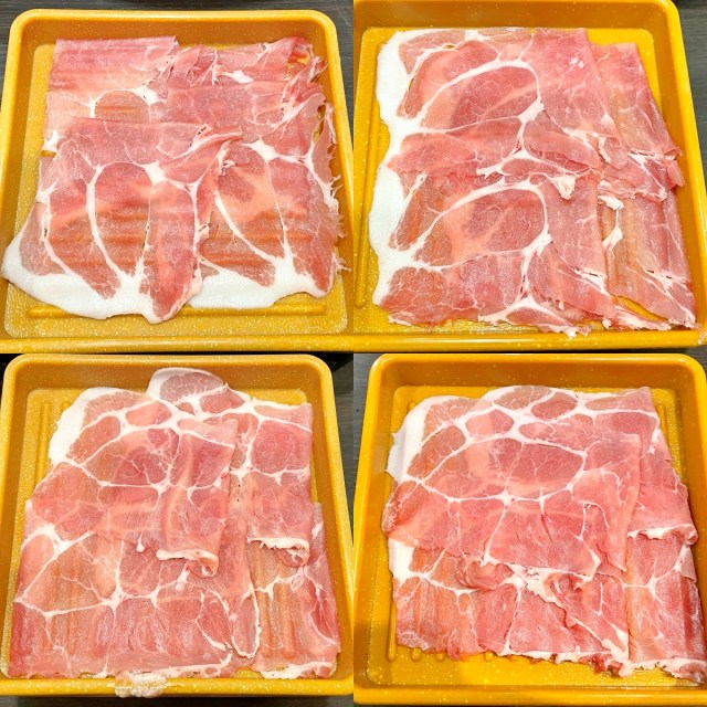 4皿それぞれを入念にチェック。分厚いとは言わないまでも、しゃぶしゃぶ用の肉としてはごく一般的な厚みだ。