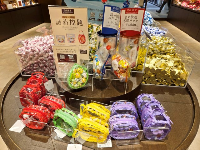 ポーチ詰め放題のコツとしては、「ファスナーを縦位置に持っていく」のが良いらしい。ポーチを筒型にしてリンドールなどを詰めていき、隙間に細長いチョコレートを突っ込むのがたくさん詰めるコツとのこと。