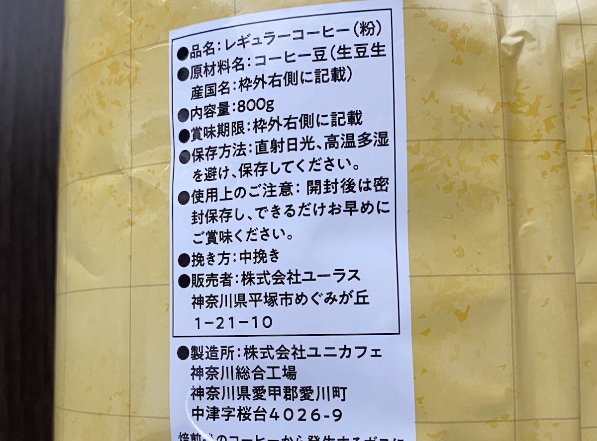 製造はその名の通りユニカフェ(UCCの子会社)。挽き方は中挽きで、商品袋にはしっかりとしたコクと程よい酸味が特長だと書かれていた。