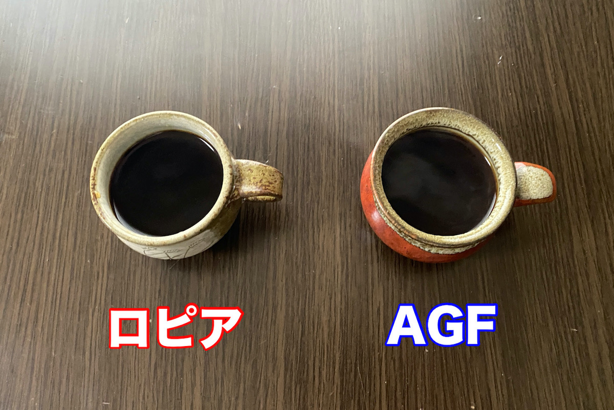 でもって、コーヒー自体の味は「AGF ちょっと贅沢な珈琲店」の方にやや苦味あり。一方、ロピアは程よい酸味で飲みやすいように感じた。