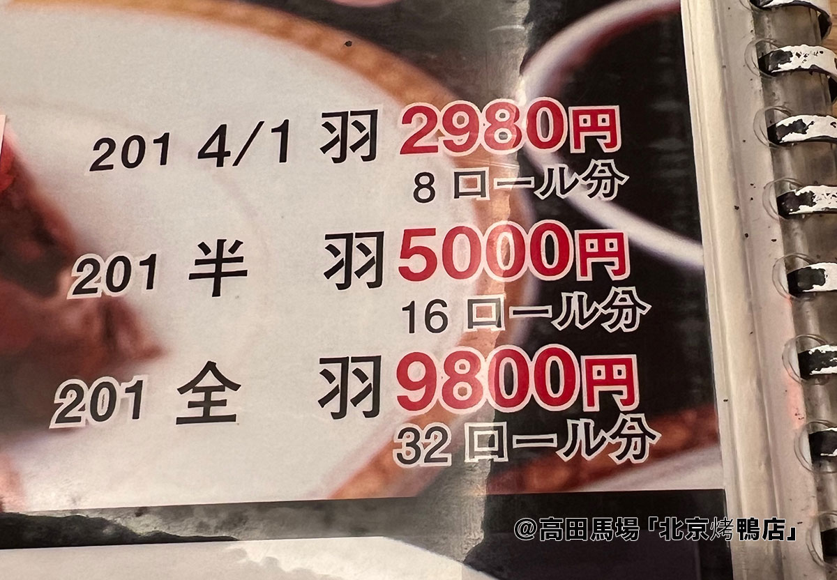 先に述べたように高田馬場の「北京烤鴨店」では1/4が2980円だったから、1/2の価格が1/4より安いってことになる。これはシンプルにコスパが良いってことなのか?