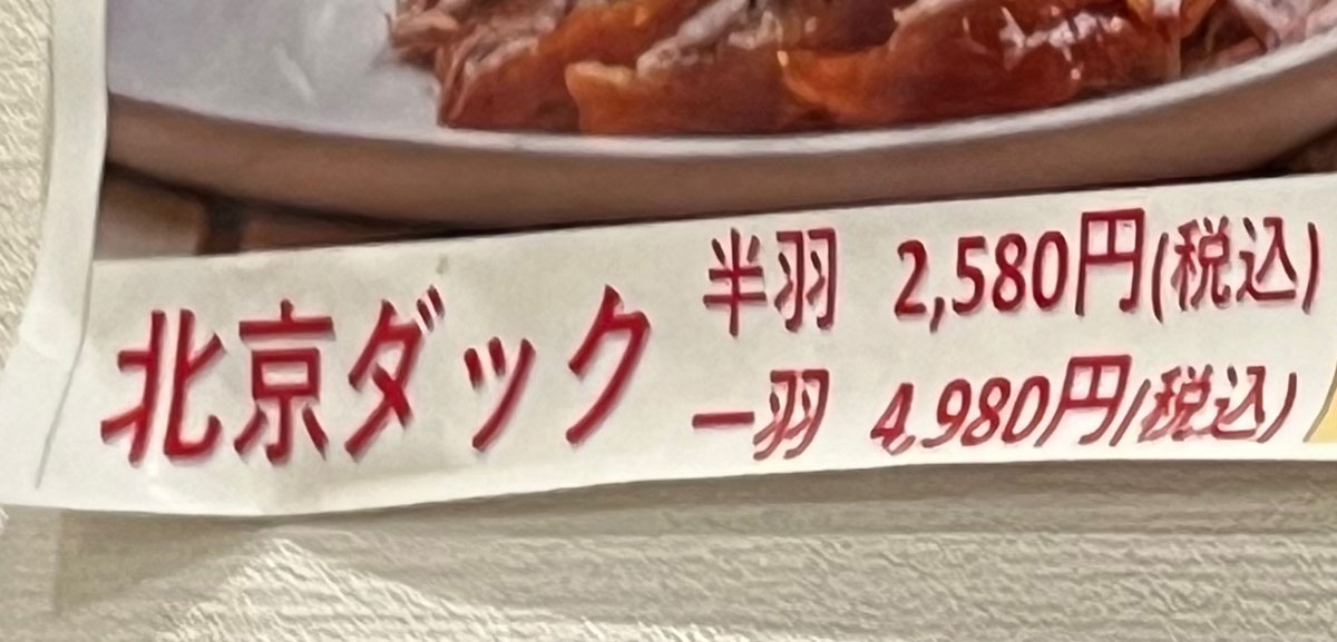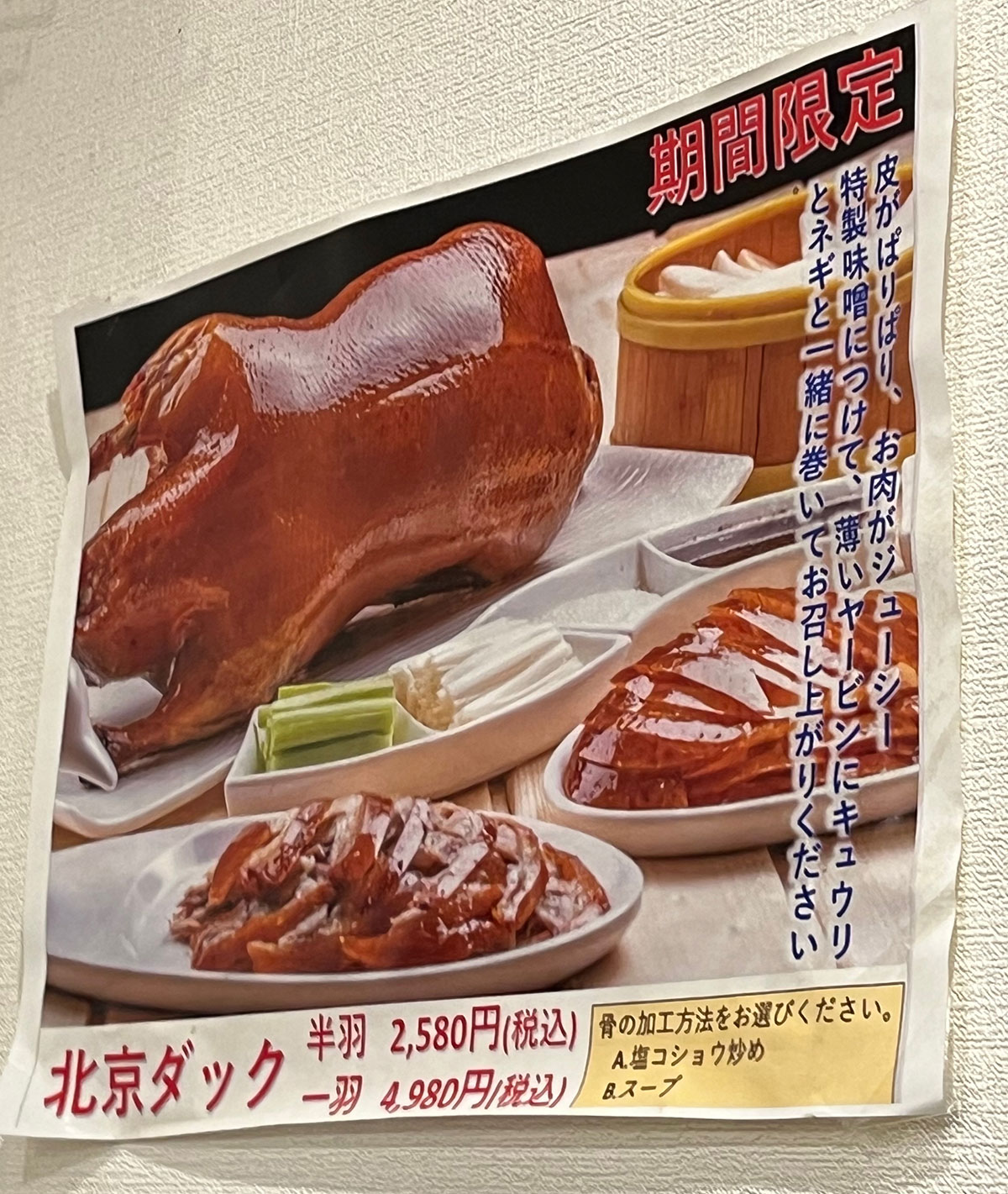 一方、先日新宿で訪れた「菜香菜」でも期間限定で北京ダックを販売しており、なんと半羽が2580円。