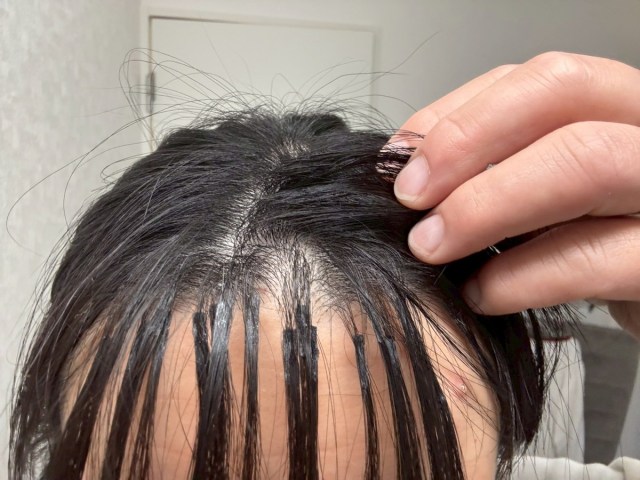 施術はかなりシンプルで、両面テープのようなもので前髪の内側に毛束を貼っていく方式。多少引っ張られる感じはあるが、痛みはそこまで強くない。