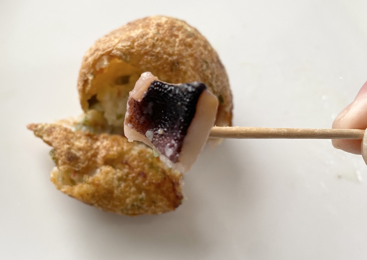 それだけに揚げたこ焼きはどんな中身で勝負しているのか。包丁で切ってみると……おぉっ! 大きめのタコが1個入っている!