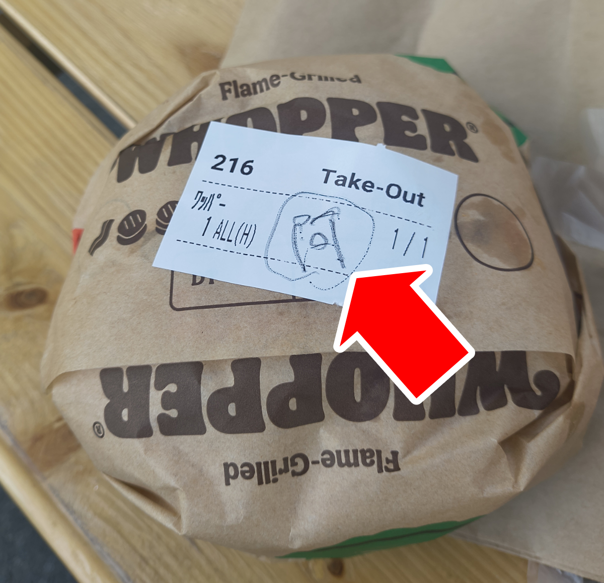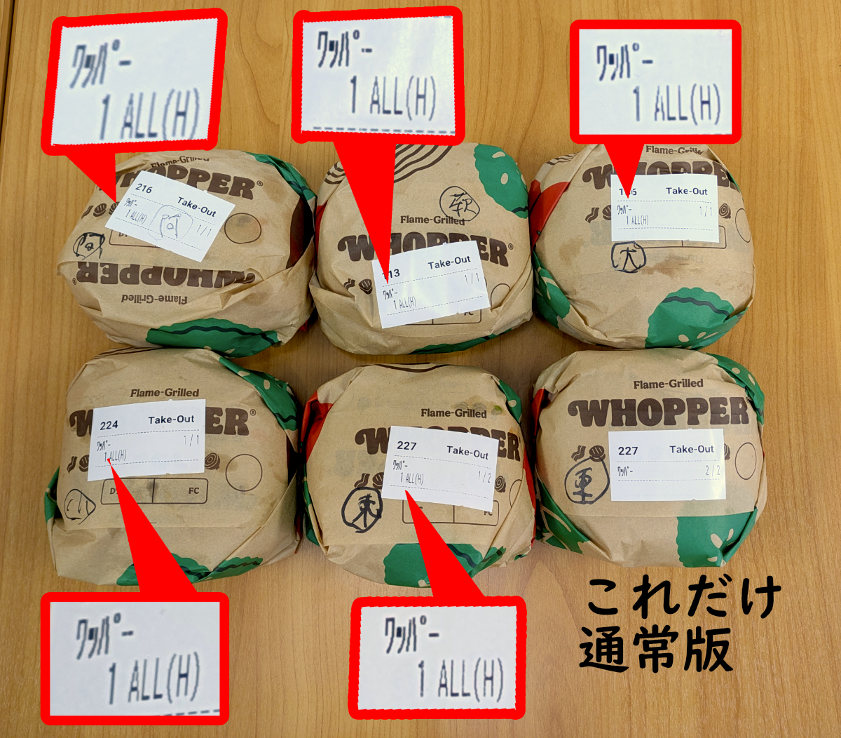 改めて購入商品を確認すると、1つの通常ワッパーを除いて、すべての商品に「ワッパー1 ALL(H)」のシールが貼ってある。