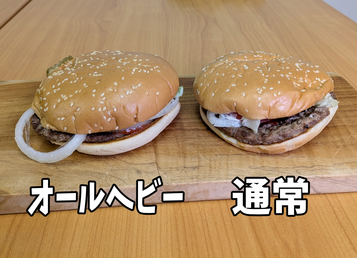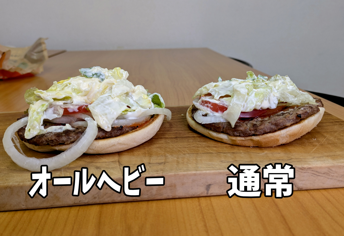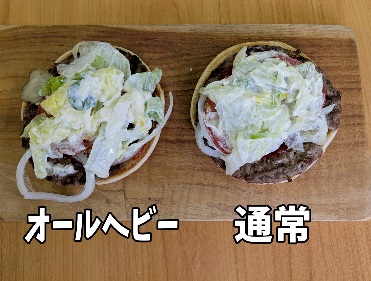 前回の検証では、見た目に違いがわからないどころか、通常版の方がレタスが多い気がしてならなかった。もしかしてオールヘビーは意味ないのか?