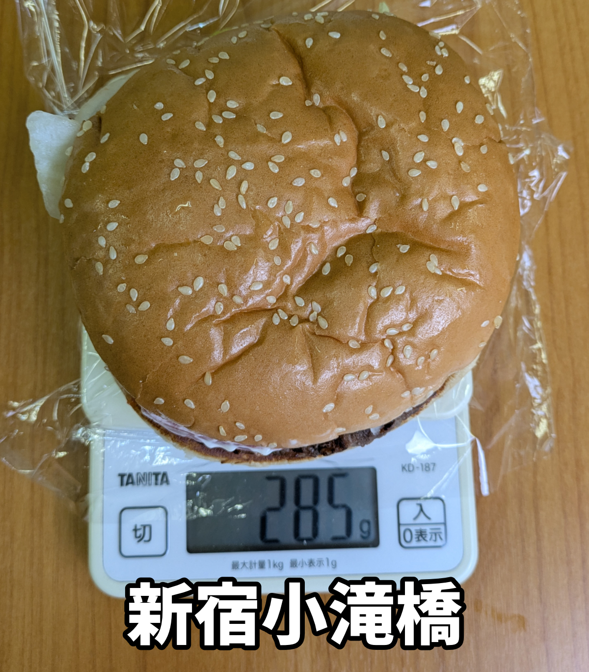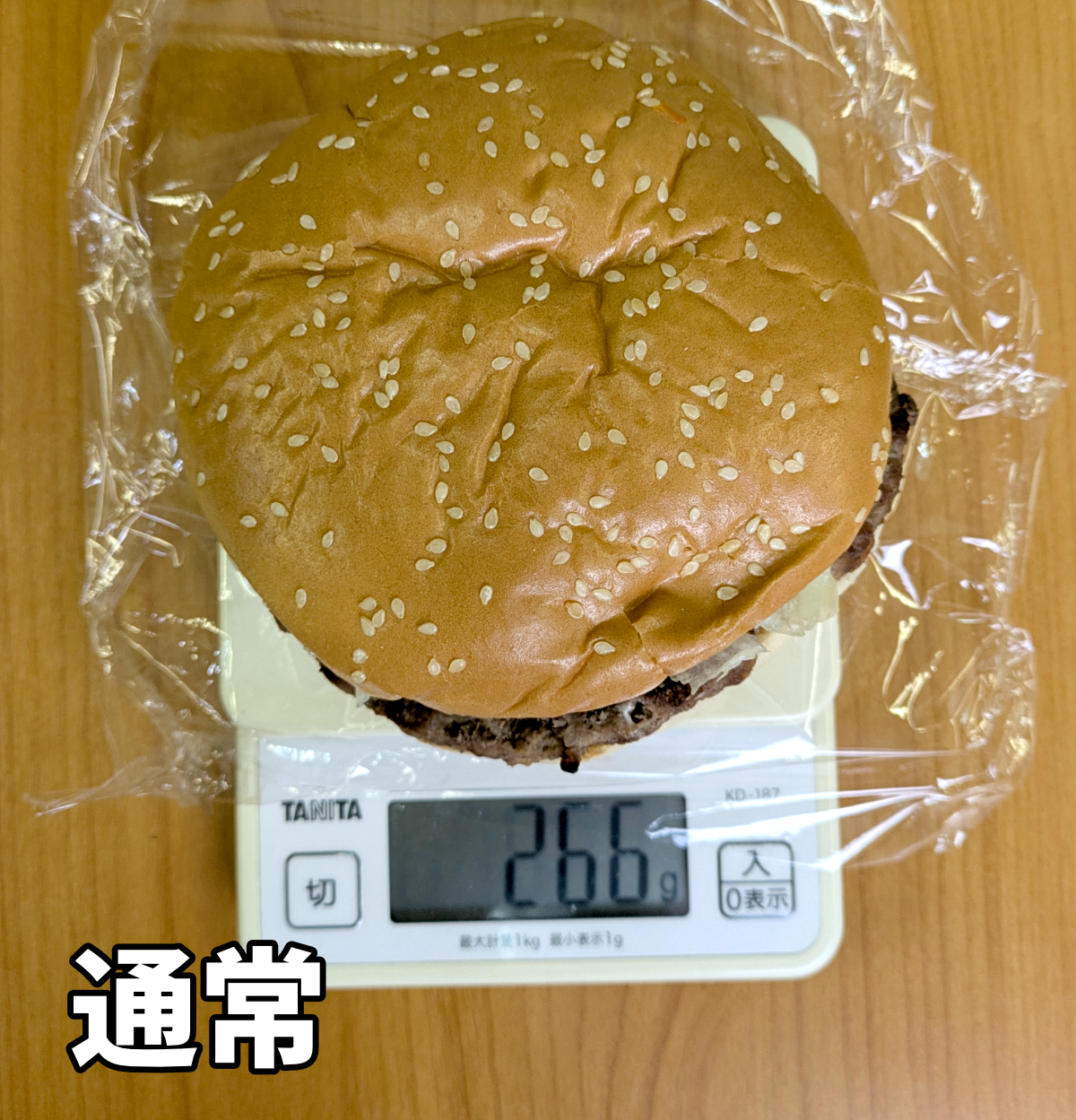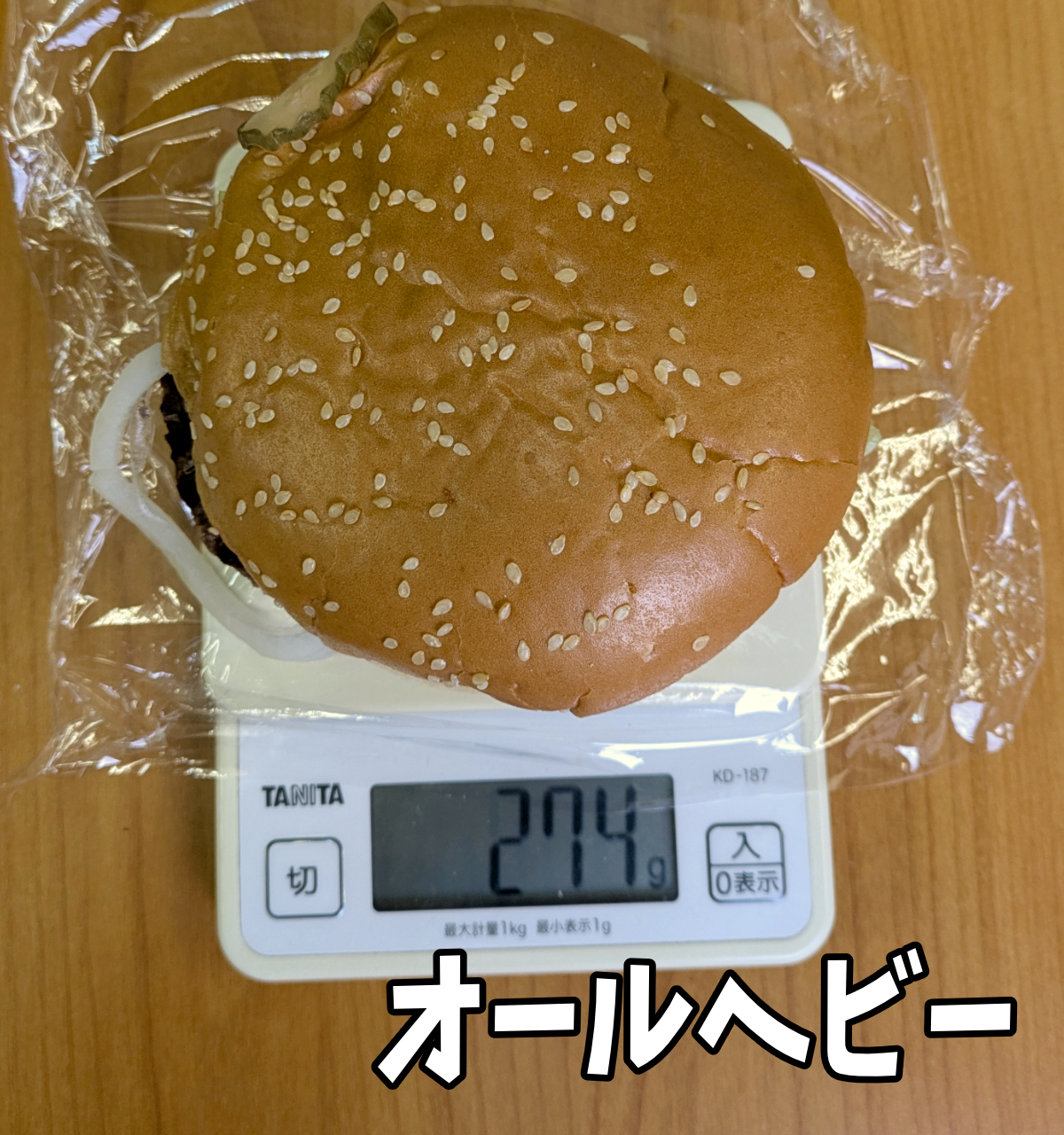 重量を確認すると、263グラム! 東口の通常版より3グラム軽い!! オールヘビーが通常より軽くなる理由は、バンズやパティの影響なのだろうか? パティの個体差を考えると、そういうこともあり得るとは思うのだが、それにしてもどうして軽くなるのだろう……。