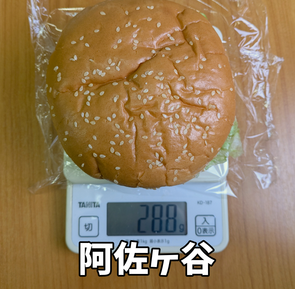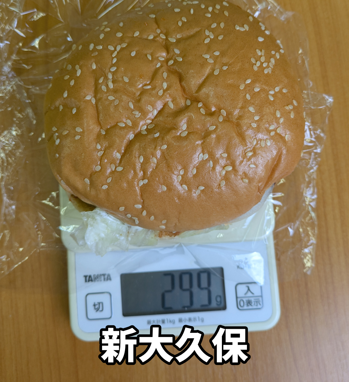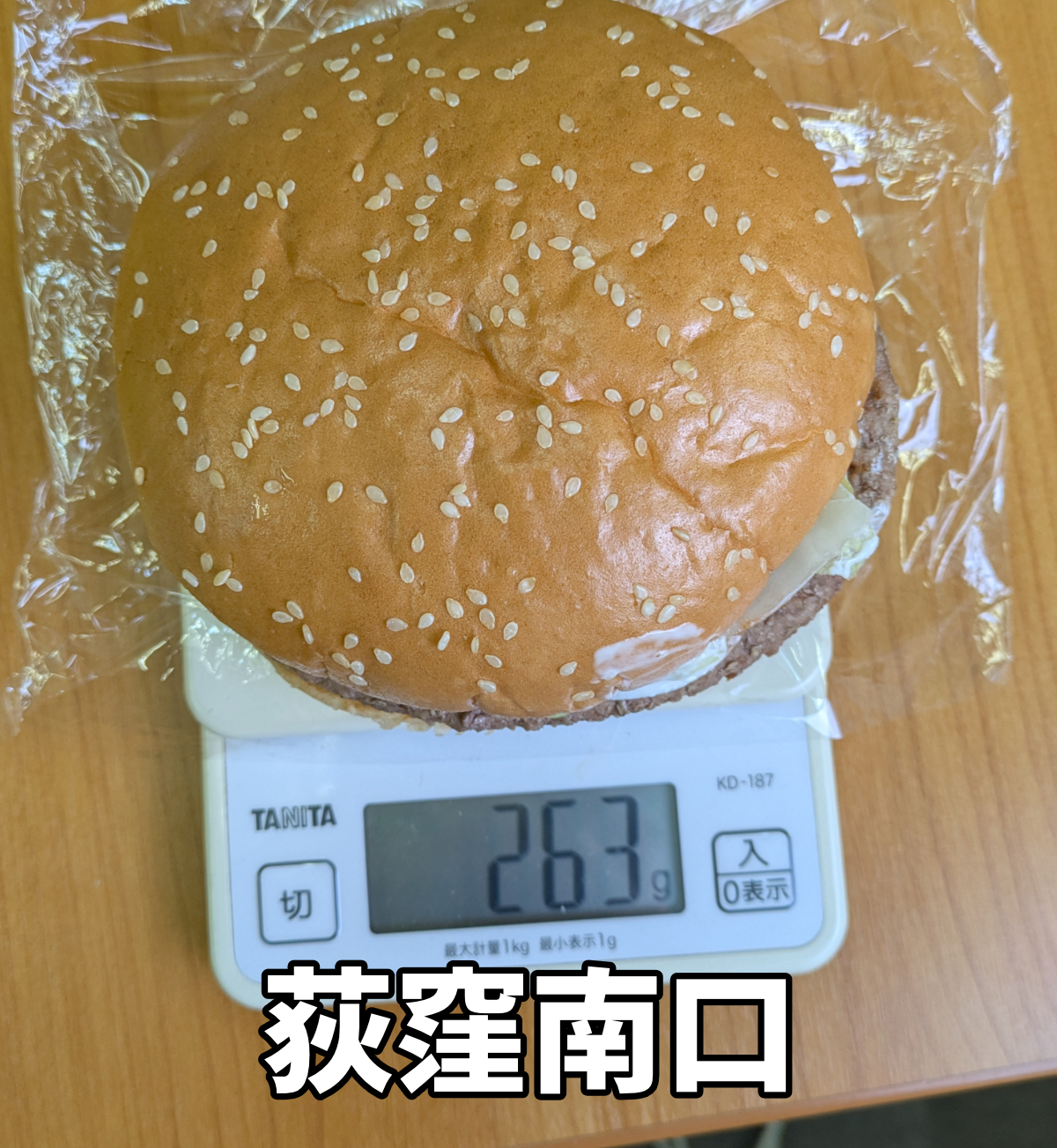 重量を確認すると、263グラム! 東口の通常版より3グラム軽い!! オールヘビーが通常より軽くなる理由は、バンズやパティの影響なのだろうか? パティの個体差を考えると、そういうこともあり得るとは思うのだが、それにしてもどうして軽くなるのだろう……。