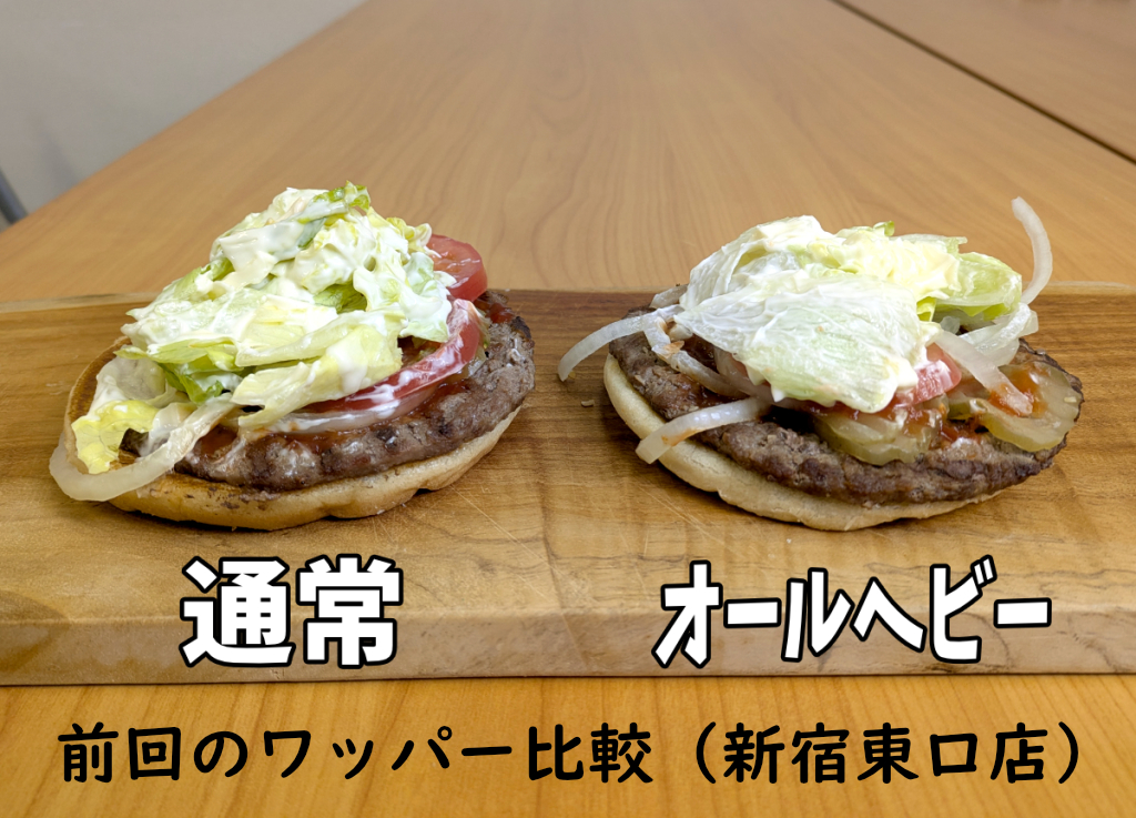 もしかして、たまたまそうだっただけなのではないか? この疑念が拭えずに再度、利用した新宿東口店で通常ワッパーとオールヘビーのワッパーを購入すると共に、他の4店舗でもオールヘビーを購入して、その量を比較してみることにした。