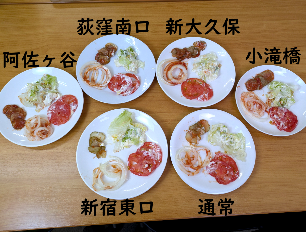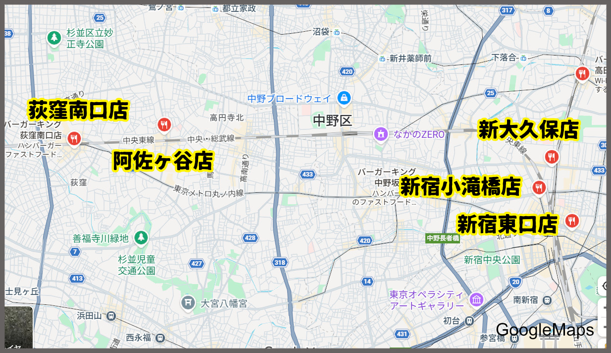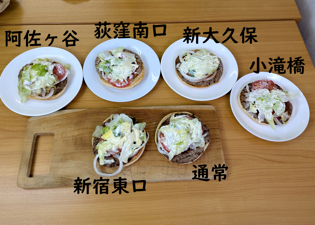 それだけでは検証として不十分と考えて、近隣の4店舗、阿佐ヶ谷店・荻窪南口店・新大久保店・新宿小滝橋店でもワッパーをオールヘビーで購入して、トッピングの具合をたしかめることにしたのだ。