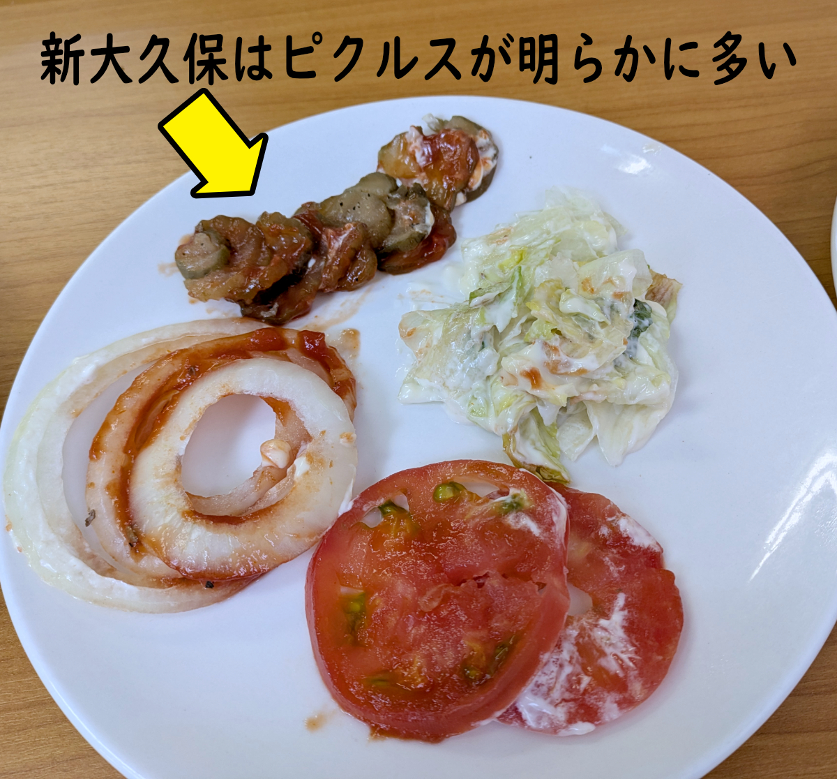 それは新大久保店、ここだけピクルスの枚数が飛び抜けて多い。他店が5~6枚であったのに対して、ここだけ10枚程度入っていたのである。たしか前回の検証でもピクルスだけはしっかり枚数が増えていたので、「オールヘビーはピクルス増量を意味する」ってことか?