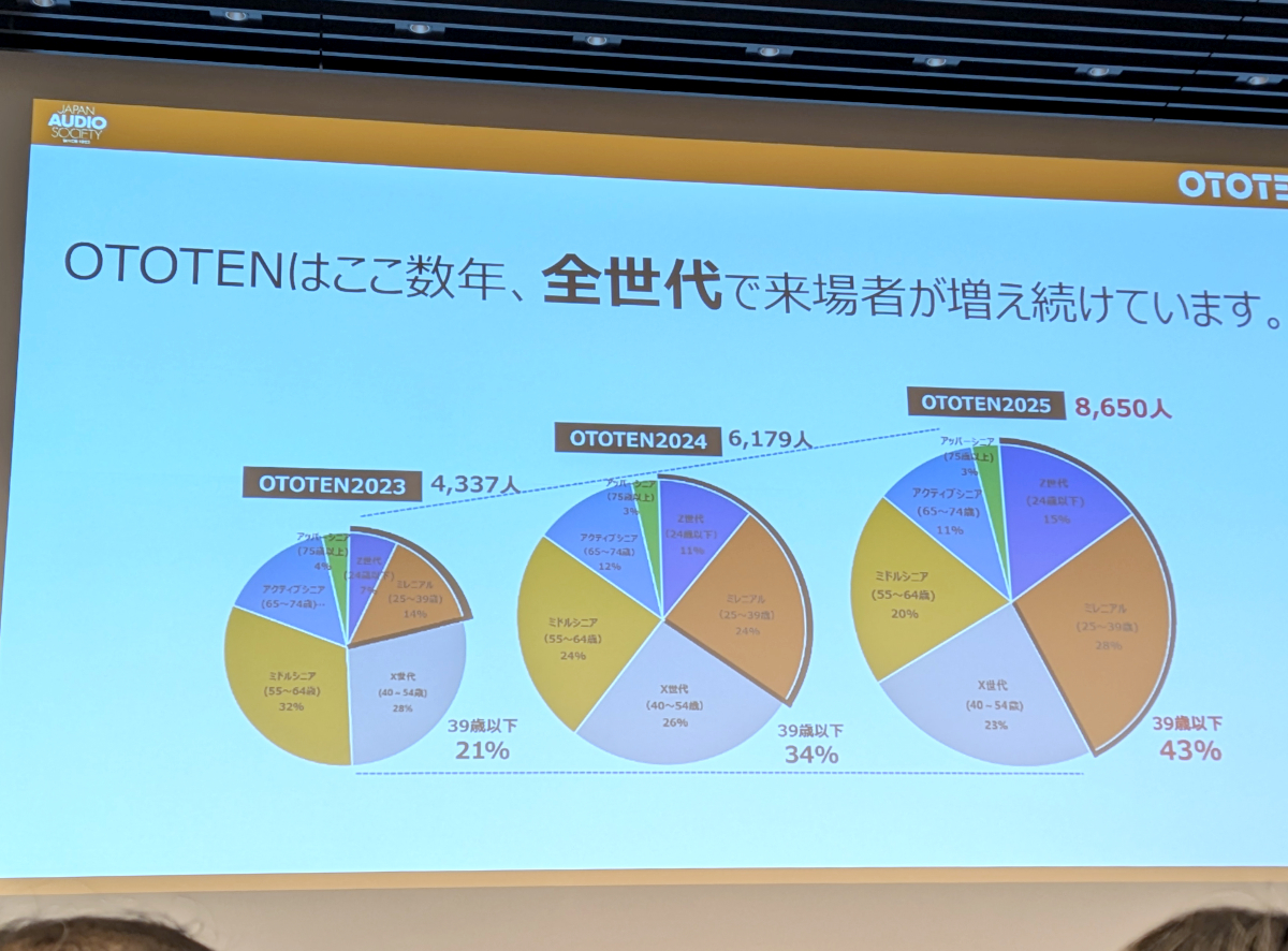 そんな豊かさに触れる機会を与えてくれる「OTOTEN」は2022年にコロナ禍から再開して以降、毎年来場者数が増えており、今年はいよいよ来場者数1万人が視野に入ってきている。全世代で来場者数が増えており、とくに若年層(40歳未満)の増加率が顕著だ。以前にも増して、オーディオが身近なものになった証だろう。