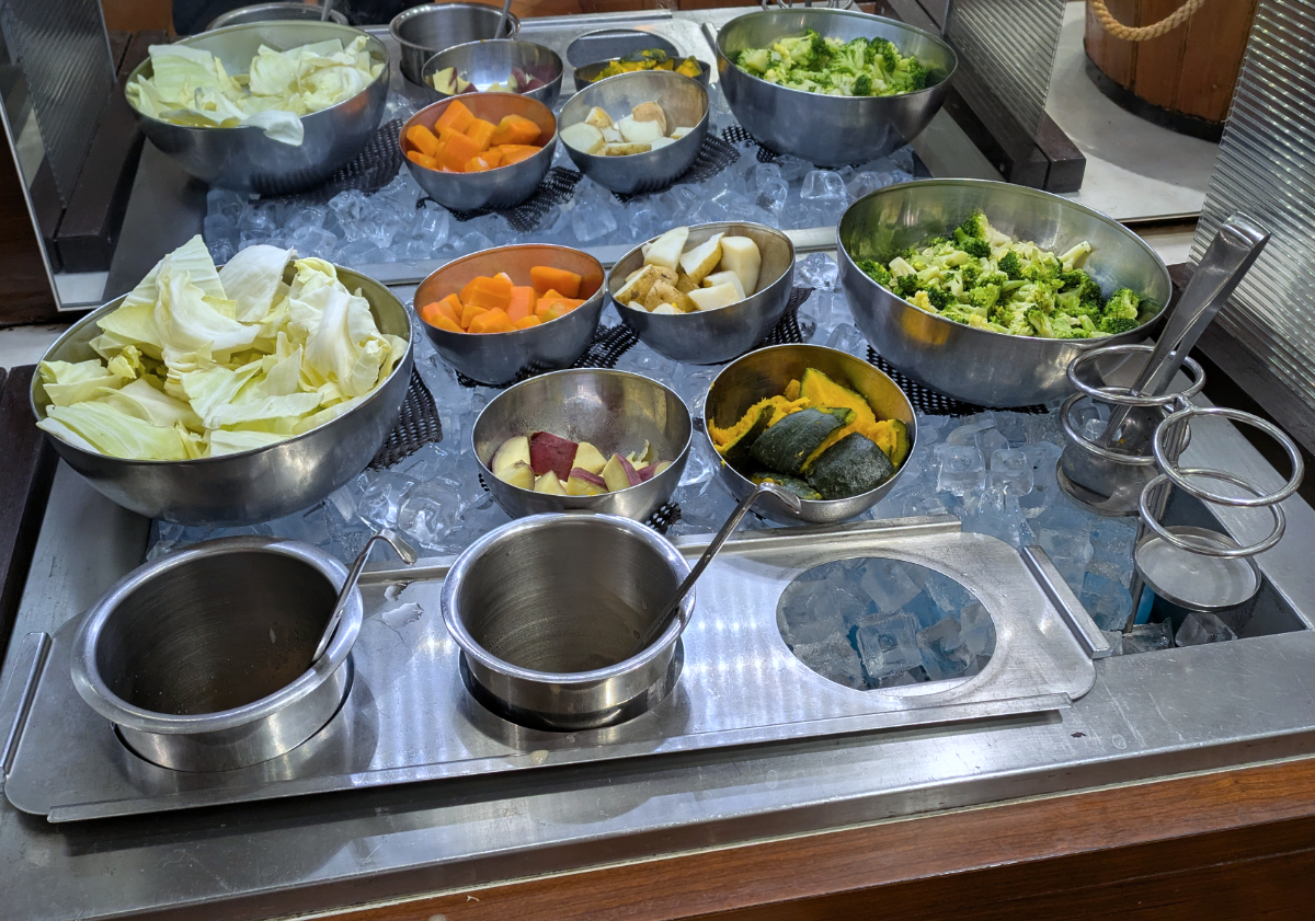 いままでいろいろサラダバーに行ったけど、こういうのなかったなあ。アンチョビソースとかあって、温めて野菜を食べられるのは良いね。とくに寒い時季はありがたいよな。