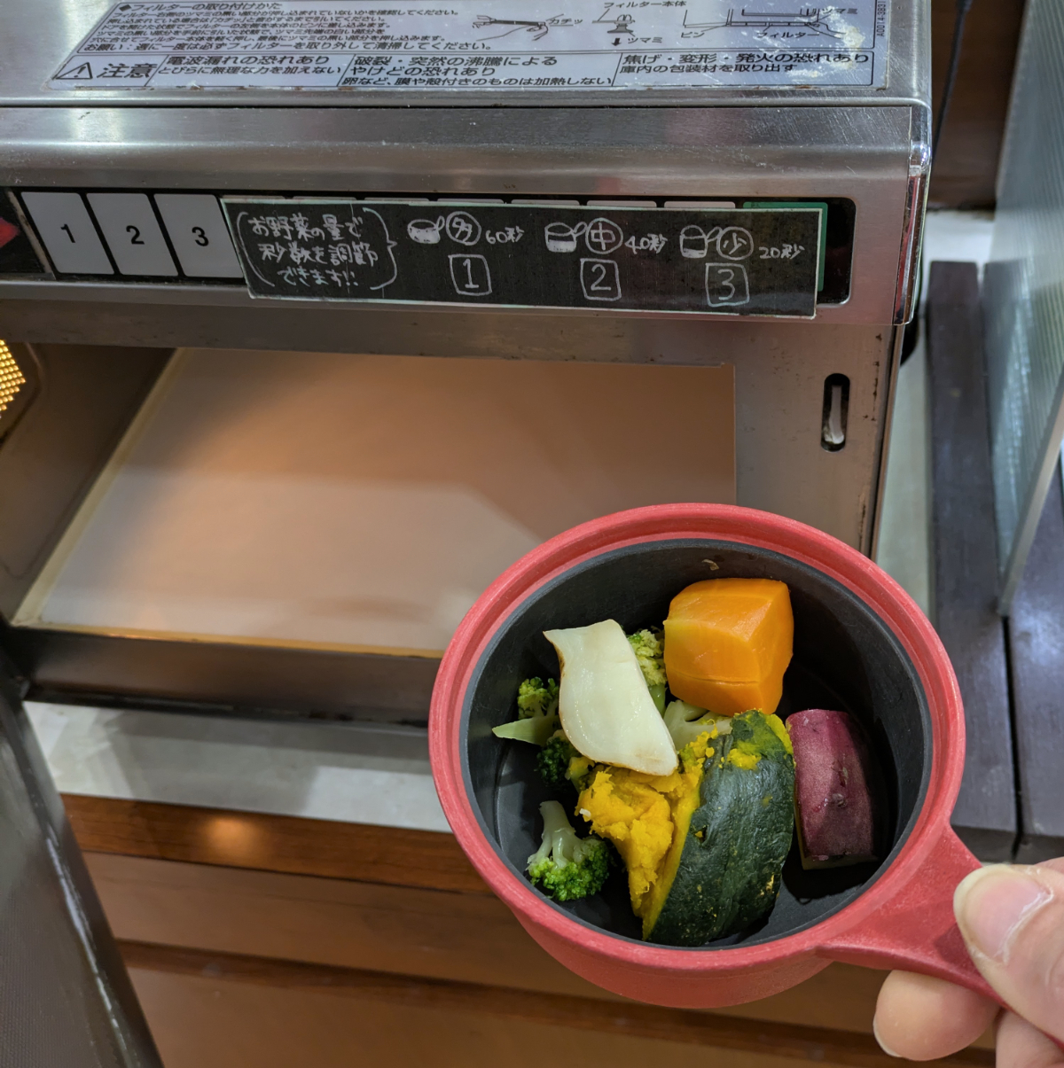 ここは温野菜のサラダもある。根菜を中心としたカット野菜が置かれており、これを自分でレンチンして温める方式。
