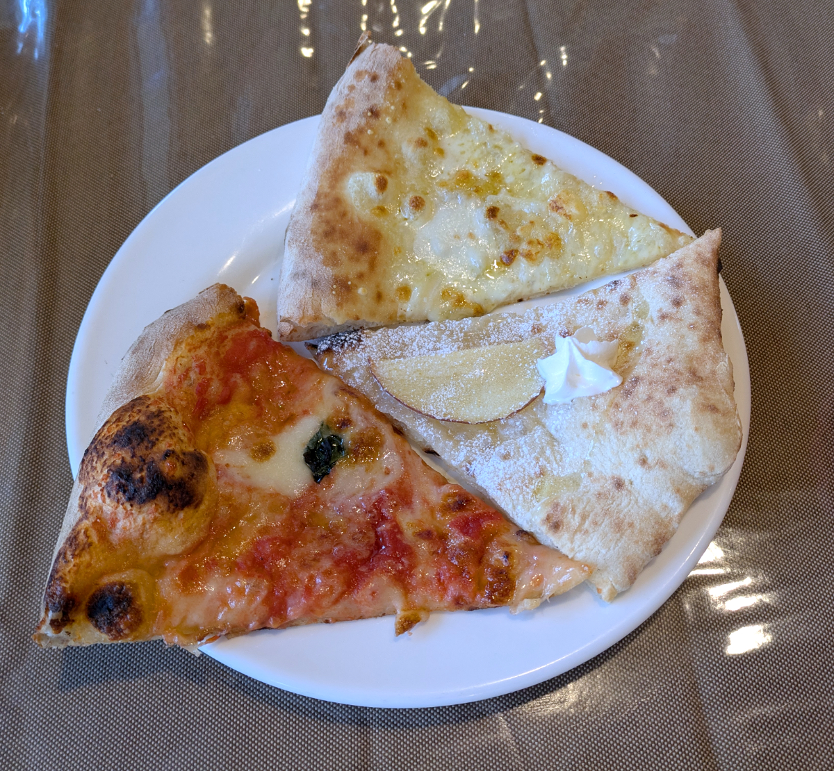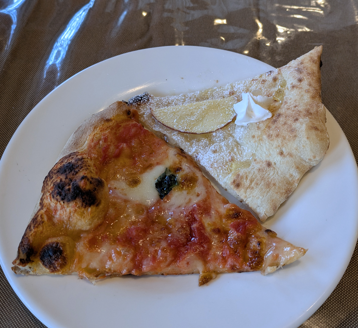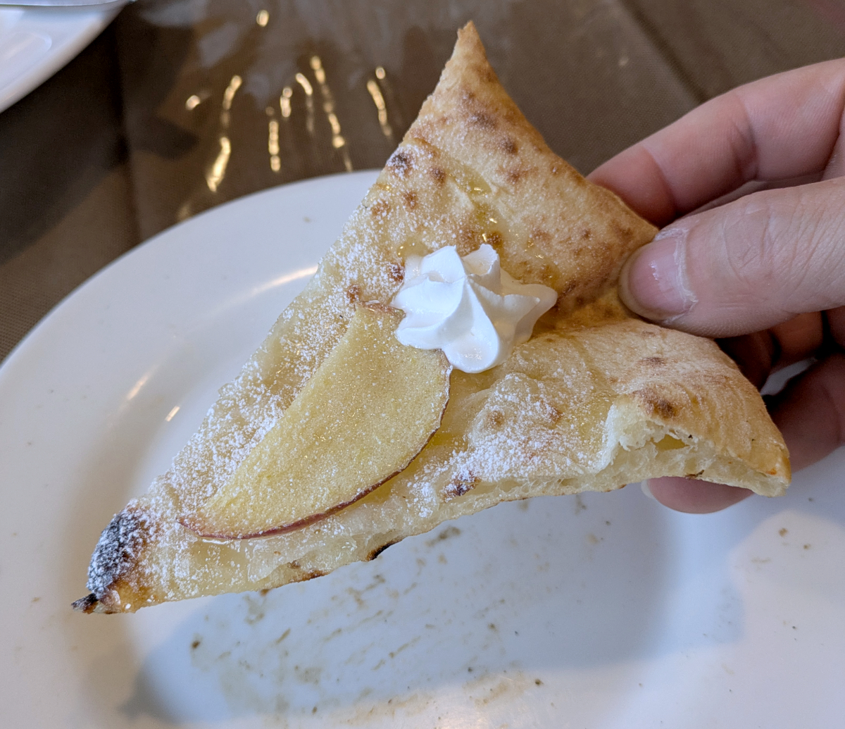 ここでようやくデザート系のりんごピザを頂く。甘味とも合うなあ、このほかにもデザートピザが巡回して来たけど、食事とデザートの境目がわからなくなりそうなので、今回はこれでデザート系は断った。