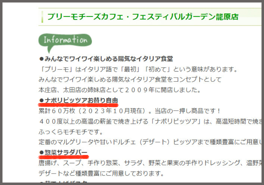そこにはやや控え目な文字で「ナポリピッツアおかわり自由」と「惣菜サラダバー」とある。薪窯で焼き上げるピザが食べ放題、おまけにサラダバーまである。しかしながらメニューの詳細はなく、なぜか持ち帰りメニューの情報しか記載がなかった。