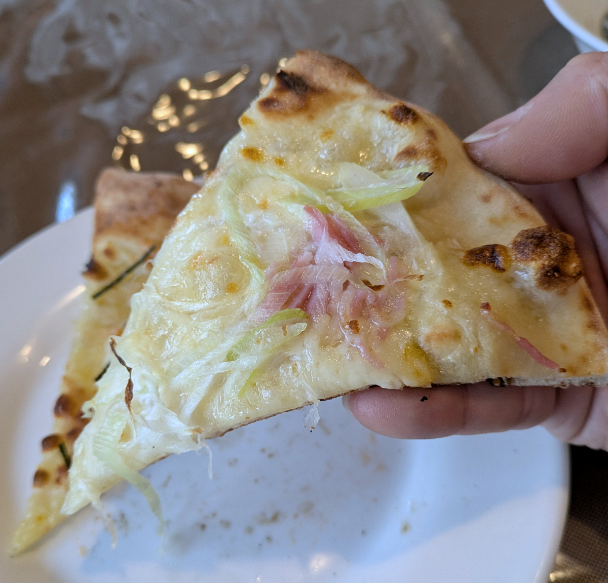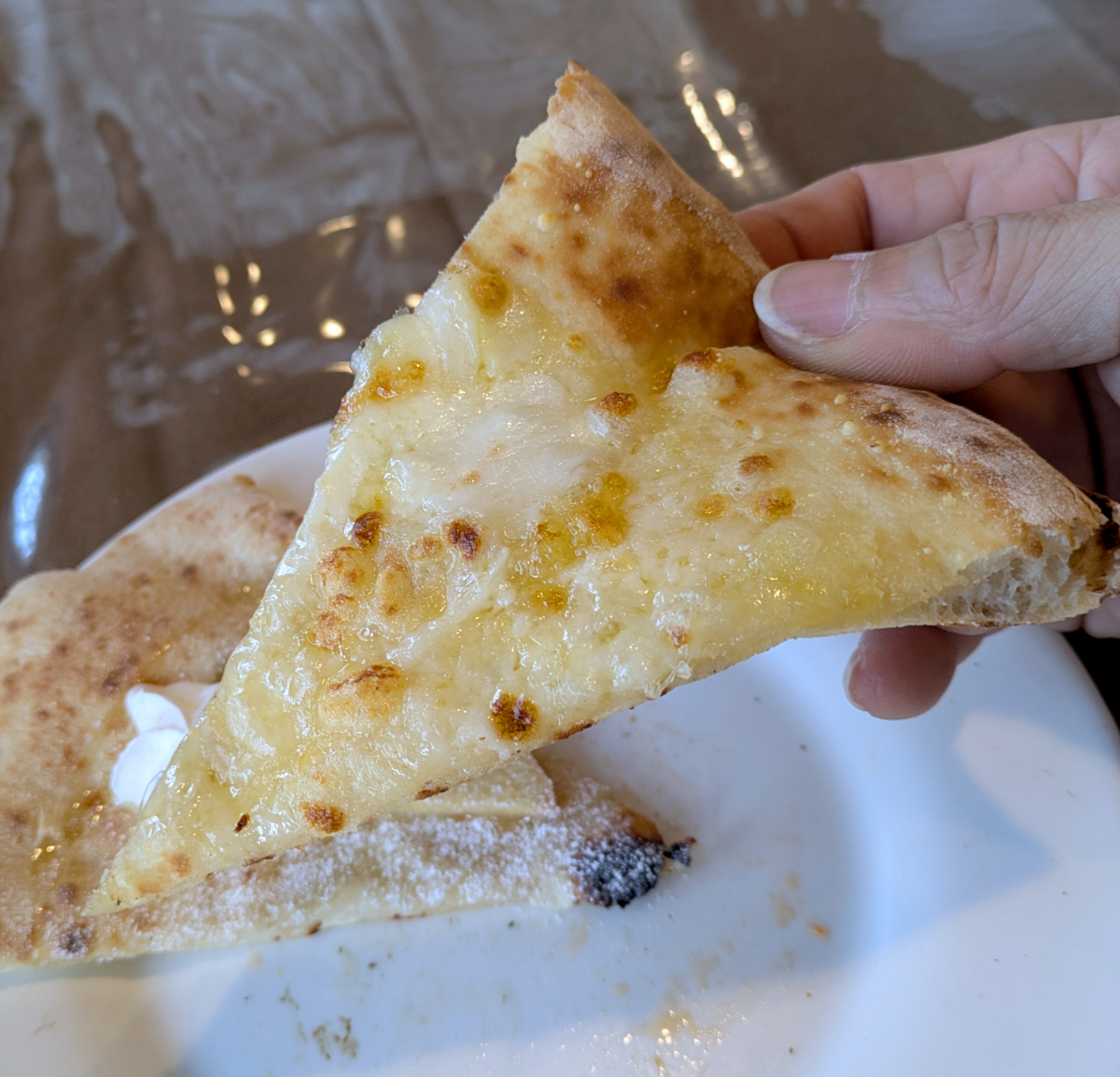 続けざまに3種のチーズ。そもそもの生地の味がどっしり安定しているので、何を乗せても美味しくなる。無論、生地とチーズの相性はバツグン。