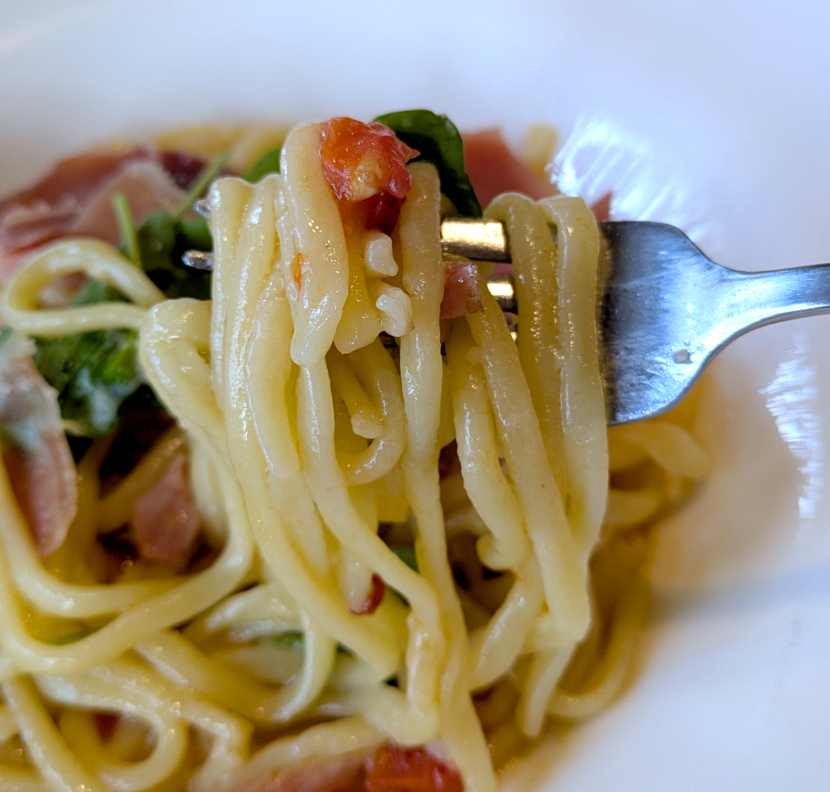 でもね、生パスタもちゃんとしてるんです。ピザ同様に食感がよく、ちゃんとアルデンテ。唐辛子とニンニクの香味をしっかりまとっており、当然ソースも乳化しております。