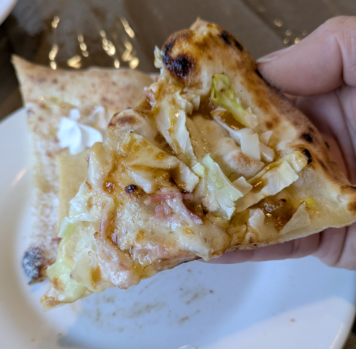 そうしている間にもピザは来続ける。次に来たのは「お好み焼き風」。意外にもソースとの相性もよく、散らしたキャベツがお好み焼き感を上手く演出している。