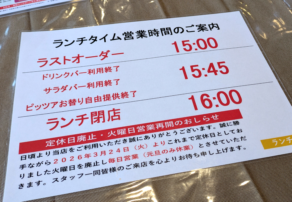 とにかく1000円台で十分にピザを楽しめるので、プリーモ・チーズカフェはおすすめ。サラダバーも充実しているので、食べ放題好きはぜひとも訪ねて頂きたい。なお、ランチのラストオーダーは15時まで、サラダバー・ドリンクバーの利用、およびピザの提供終了は15時45分までとなっているので、その点だけ注意して頂きたい。
