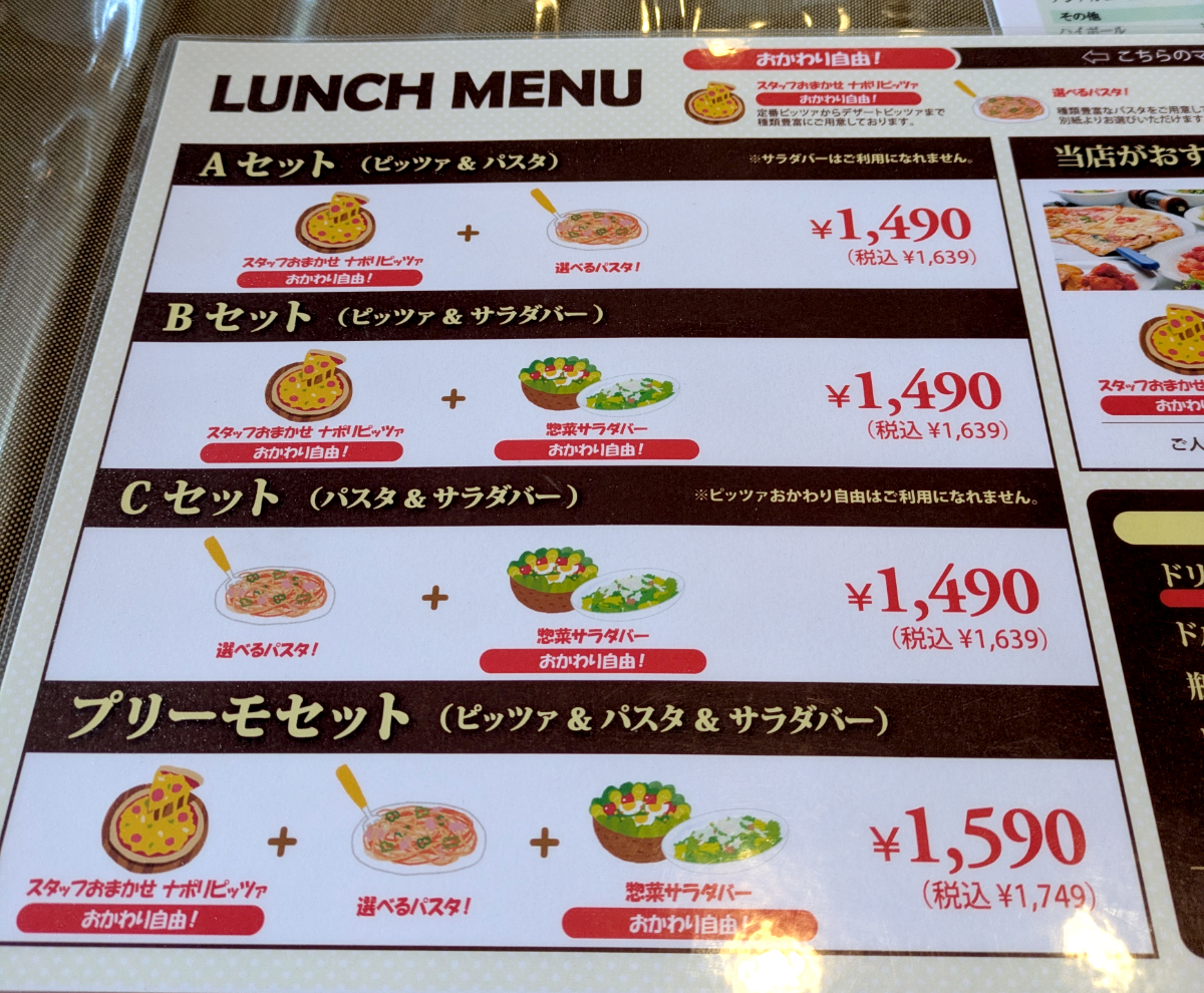 さて、メニューを見ると、4つのセットはいずれも1000円台でリーズナブル。食べ放題ピザとパスタの「Aセット」、ピザとサラダバーの「Bセット」、パスタとサラダバーの「Cセット」、この3つが税込1639円。