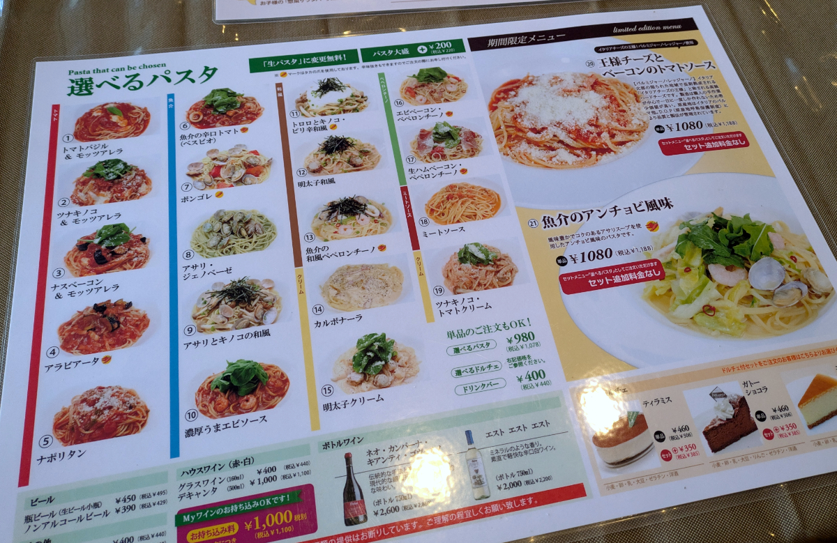 選べるパスタは全21種類。トマトソースから魚介、和風、クリーム系などひと通り揃っており、生パスタへの変更は無料だ。「生ハムベーコンのペペロンチーノ」でお願いした。