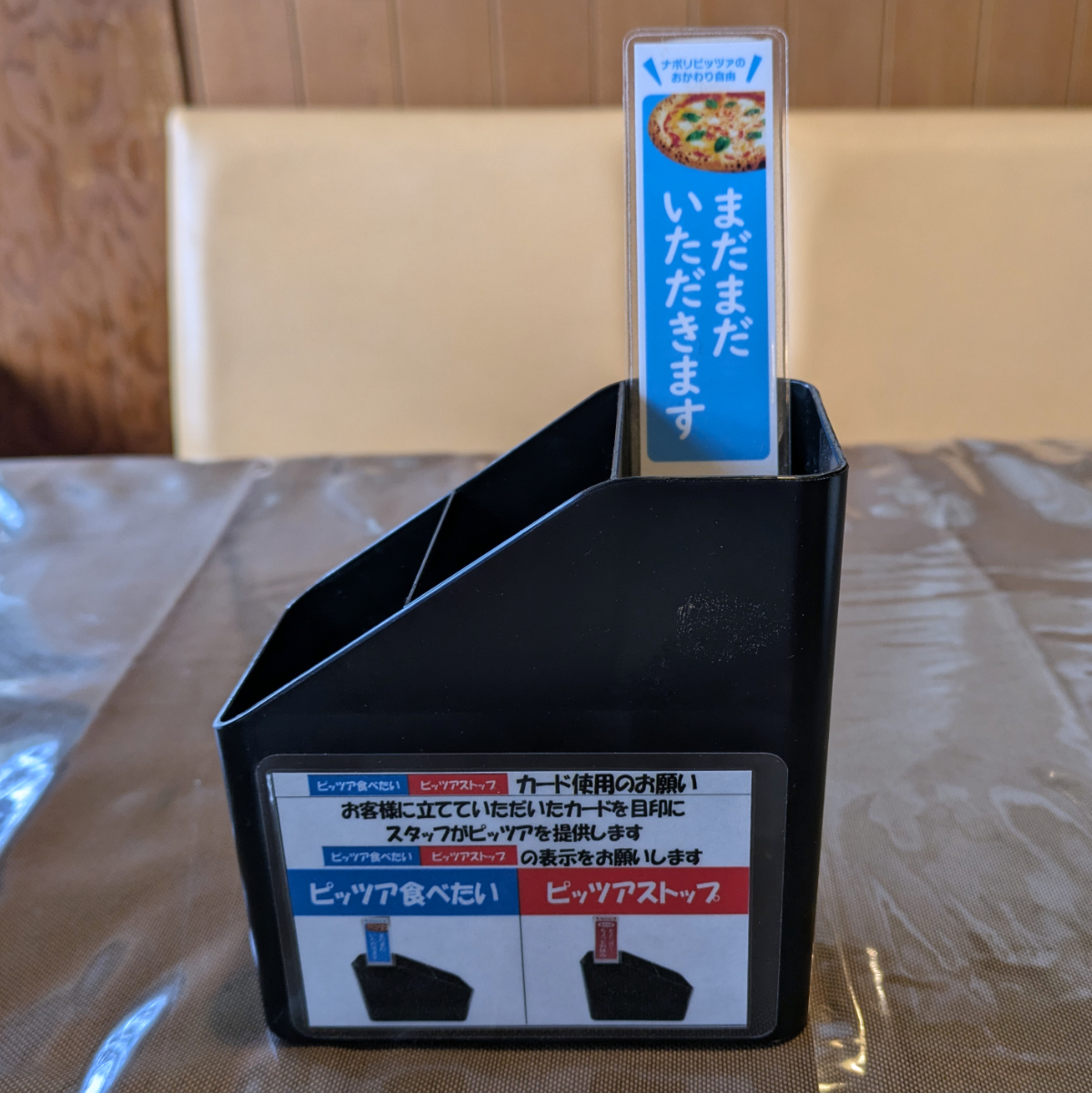 卓上の札はピザの巡回を受けるか受けないかを示すものだ。お腹がいっぱいになったら札を逆に向けて、おかわりを断るという仕組み。