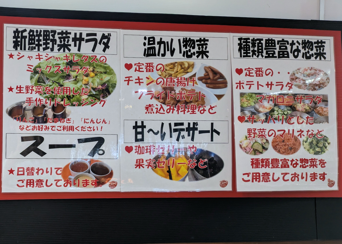 サラダバーというから生野菜だけだと思ったら、「スープ」も「デザート」もついていることがここでわかった。さらに「から揚げ」もあるようだ。つまりサラダバーと言いながら、サラダだけじゃない。