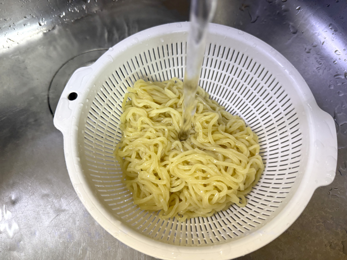 6分後、ざるにあけて麺を冷ます。