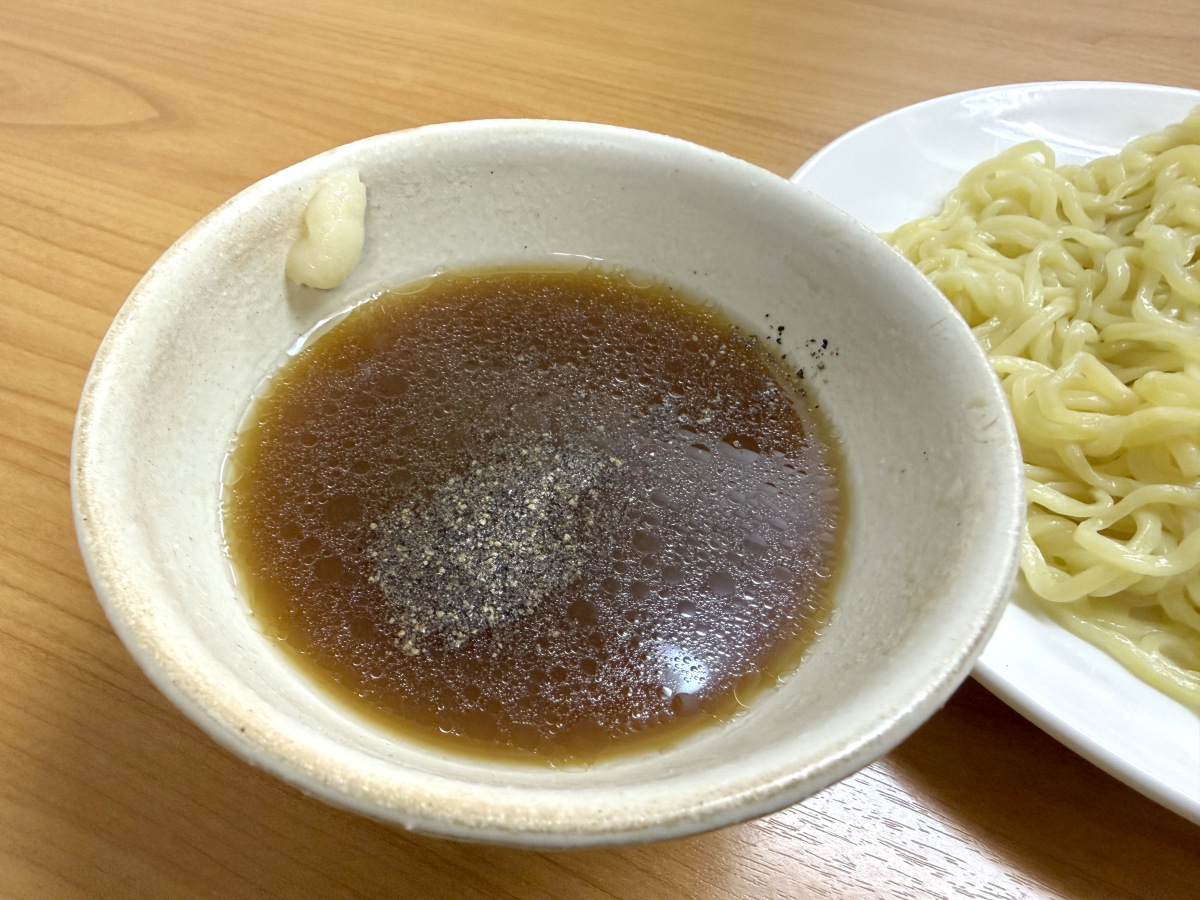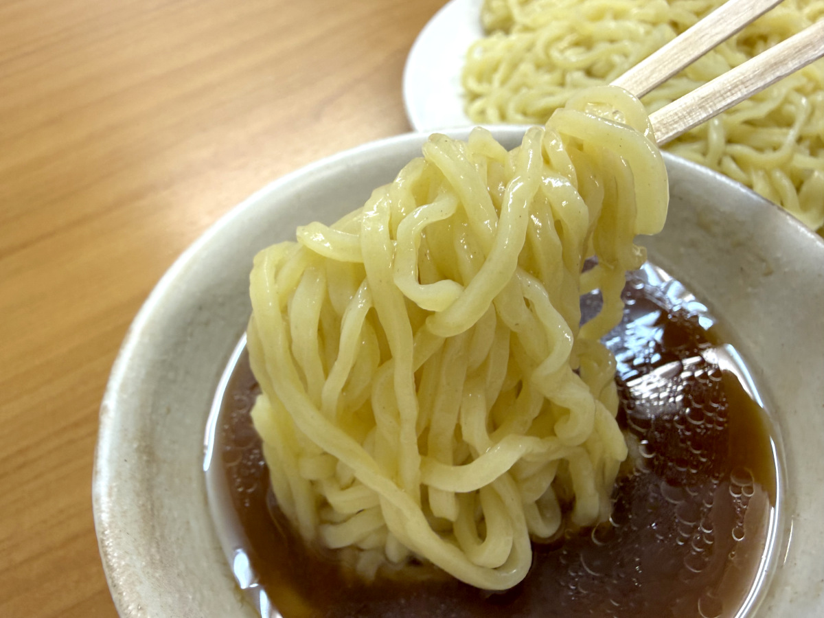 気になるお味は……ほう、悪くない。つけ汁は甘みとほのかな酸味が効いた醤油テイスト。つけ麺専門店というよりは、昔ながらのラーメン店にありそうなつけ汁だ。