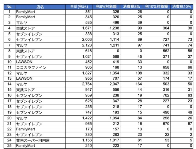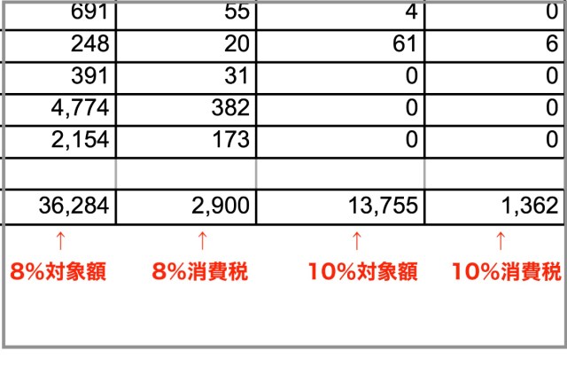 ここからが本題。レシート55枚を1枚ずつエクセルに打ち込んで、「8%対象額」「10%対象額」を抜き出していく作業に取り掛かった。