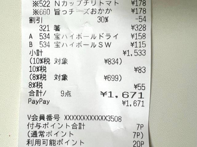 合計1671円のうち、8%税が55円、10%税が83円。たった1回の買い物で消費税138円。数字として可視化されると、なかなかに重い。