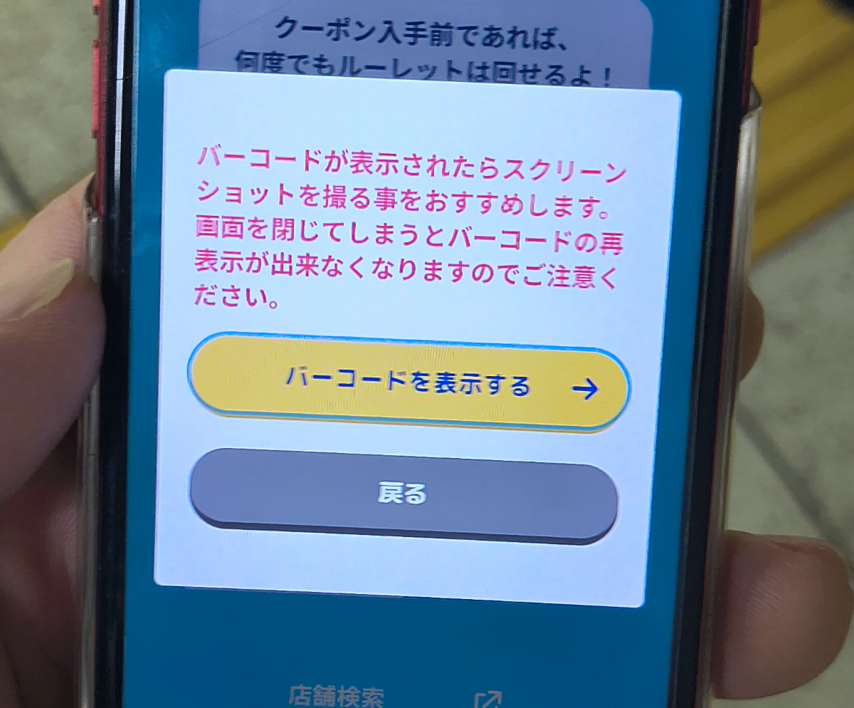 ちんたらしている間に1分以上が経過してしまった。そのため前の画面に戻されてしまった。当選したらすぐにバーコード表示画面に移った方が良さそうだ。
