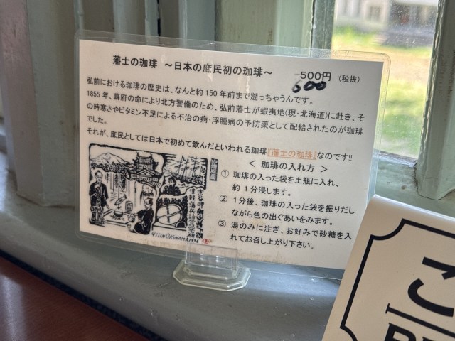 そんな洋館のひとつ、旧東奥義塾外人教師館の一階「サロン・ド・カフェ・アンジュ」で、筆者はあるメニューを見つけた。通常のコーヒーメニューもあるのだけれど、それとは別に「藩士の珈琲」(税抜600円)というのが目にとまる。