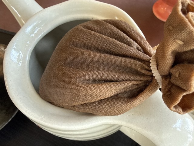 今はあまり見ないけれど、銭湯の「薬湯」をほんのり連想させる。昔うちの近くのスーパー銭湯には、ちょうどこんな巾着袋に薬草をつめた湯船があって、浴室中が強烈な匂いに包まれていた。もみしだくと中から薬効成分が出てくるのだ。