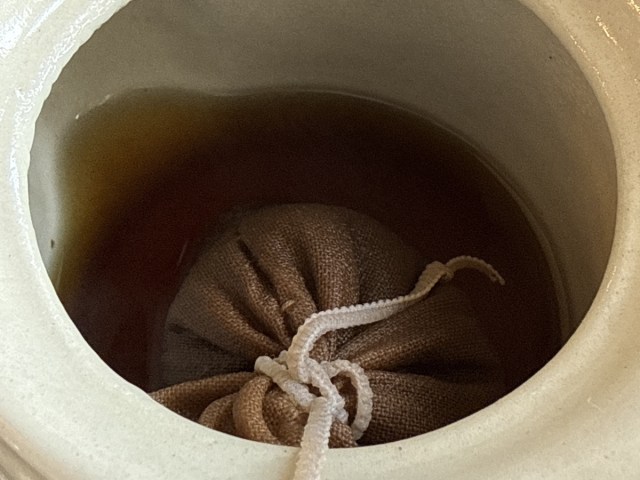 ポットにはすでにお湯が入っているので、1分ほどかけて抽出する。ヒモで振り出しながら、好みの濃さになるまで待つ。