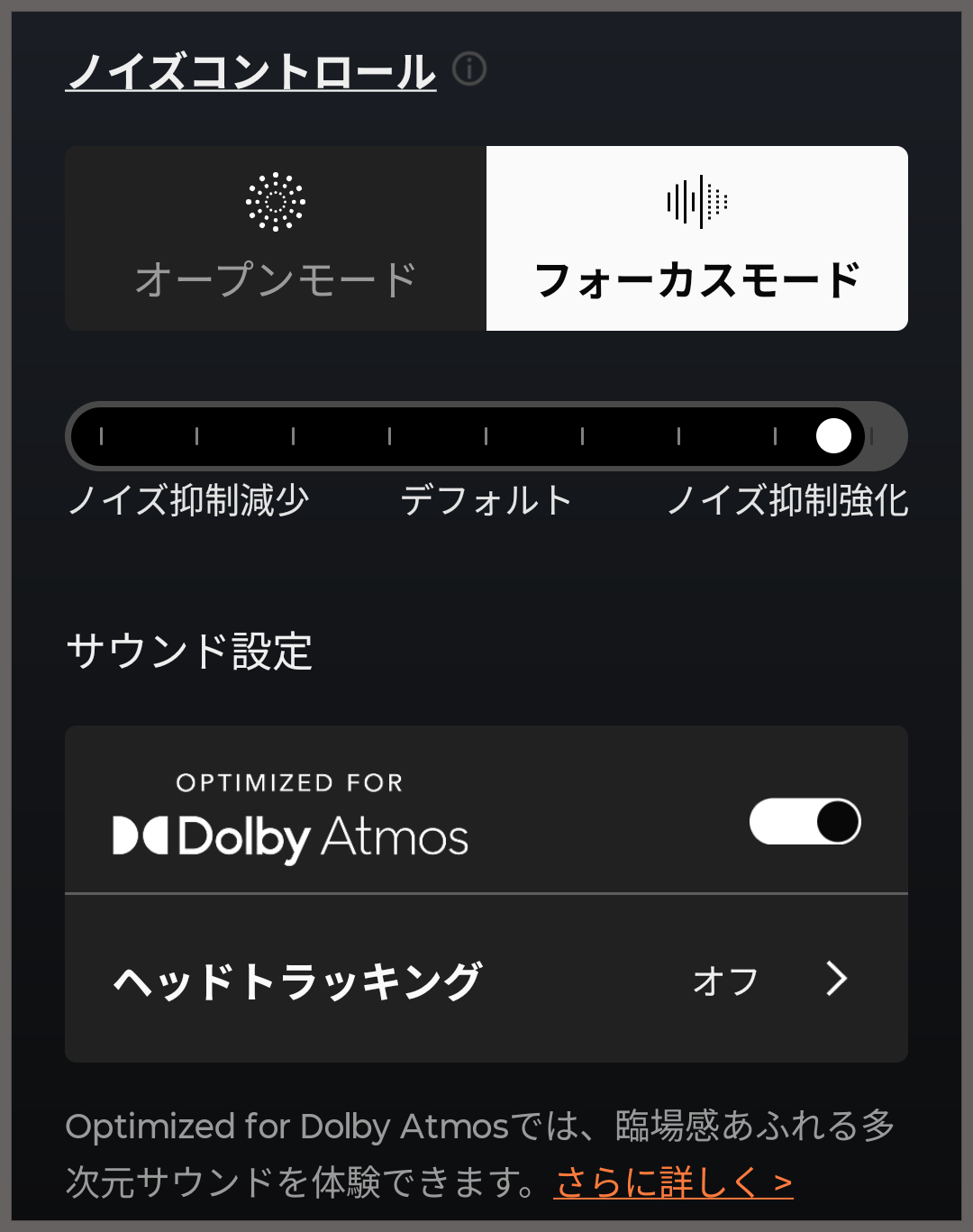 カフェで作業をしたい時や、新幹線の移動時などに抑制を強化すれば、やることにより集中できるはず。ちなみに「Dolby Atmos」にも対応しており、ヘッドトラッキングをオンにすると、さらに臨場感のある立体音響を楽しめるだろう。