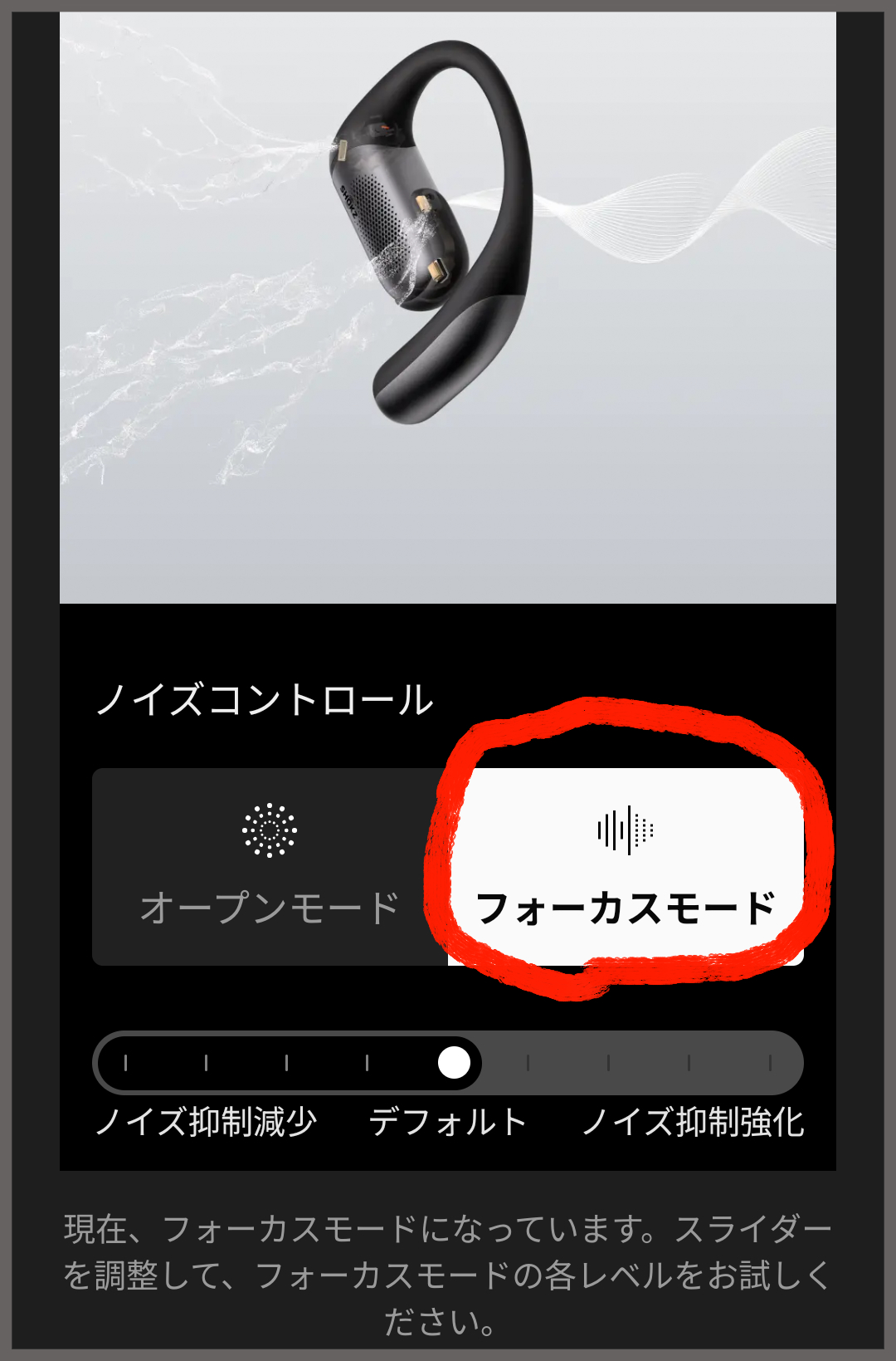 ただ、オープンモードで聞いていると部屋のささやかなノイズ。たとえば冷蔵庫や換気扇の振動ノイズがしっかり耳に届いている。部屋で聞くとはいえ、無音ではないので仕方がないとは思う。それを打ち消すのがフォーカスモードだ。これに切り替えると……。