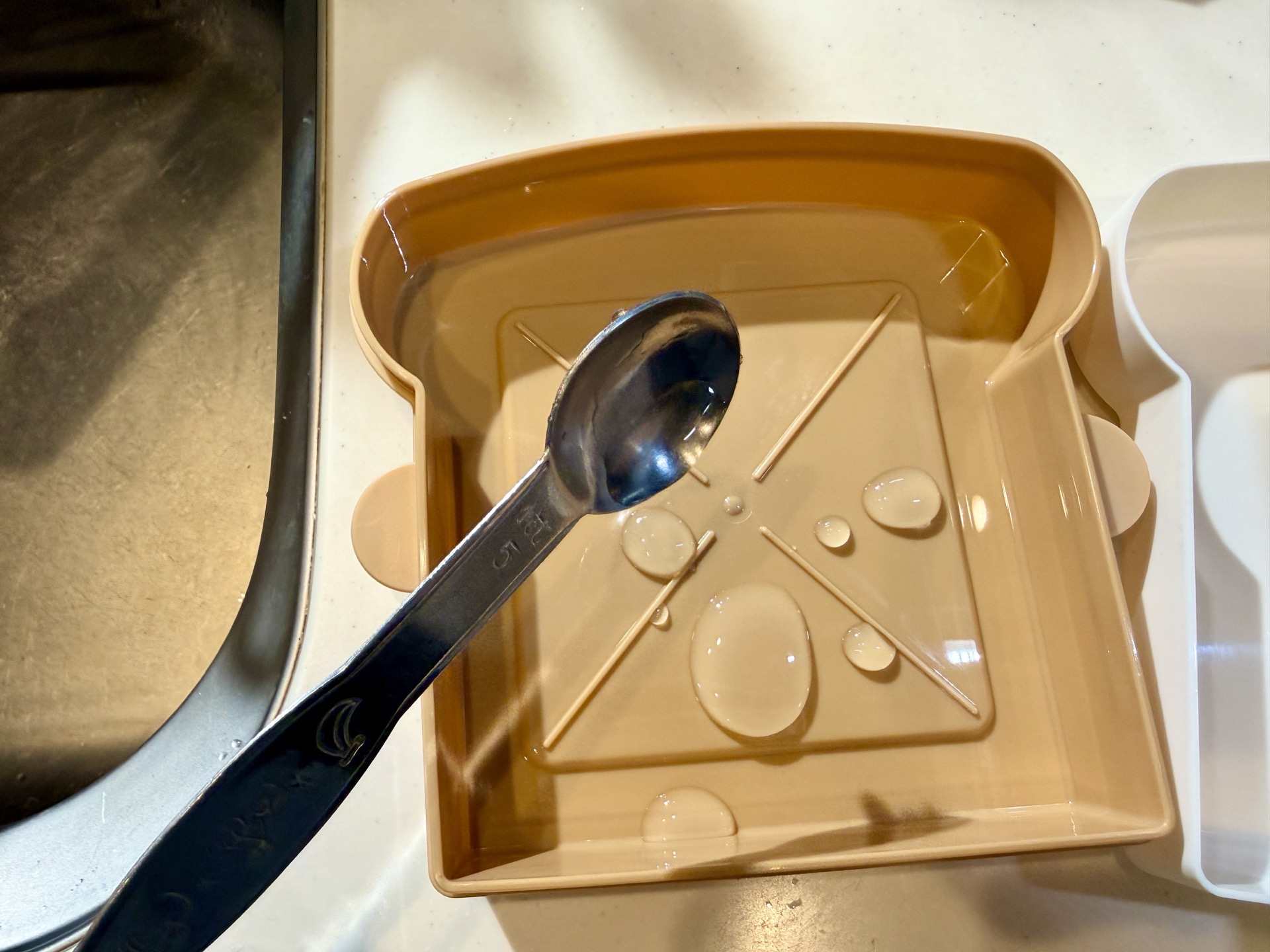 容器を開けると、中には “すのこ” のようなパーツが入っている。説明によると、ここに小さじ1杯の水を入れ、500Wで加熱すると、蒸気が循環してパンがふわふわモチモチになるらしい。