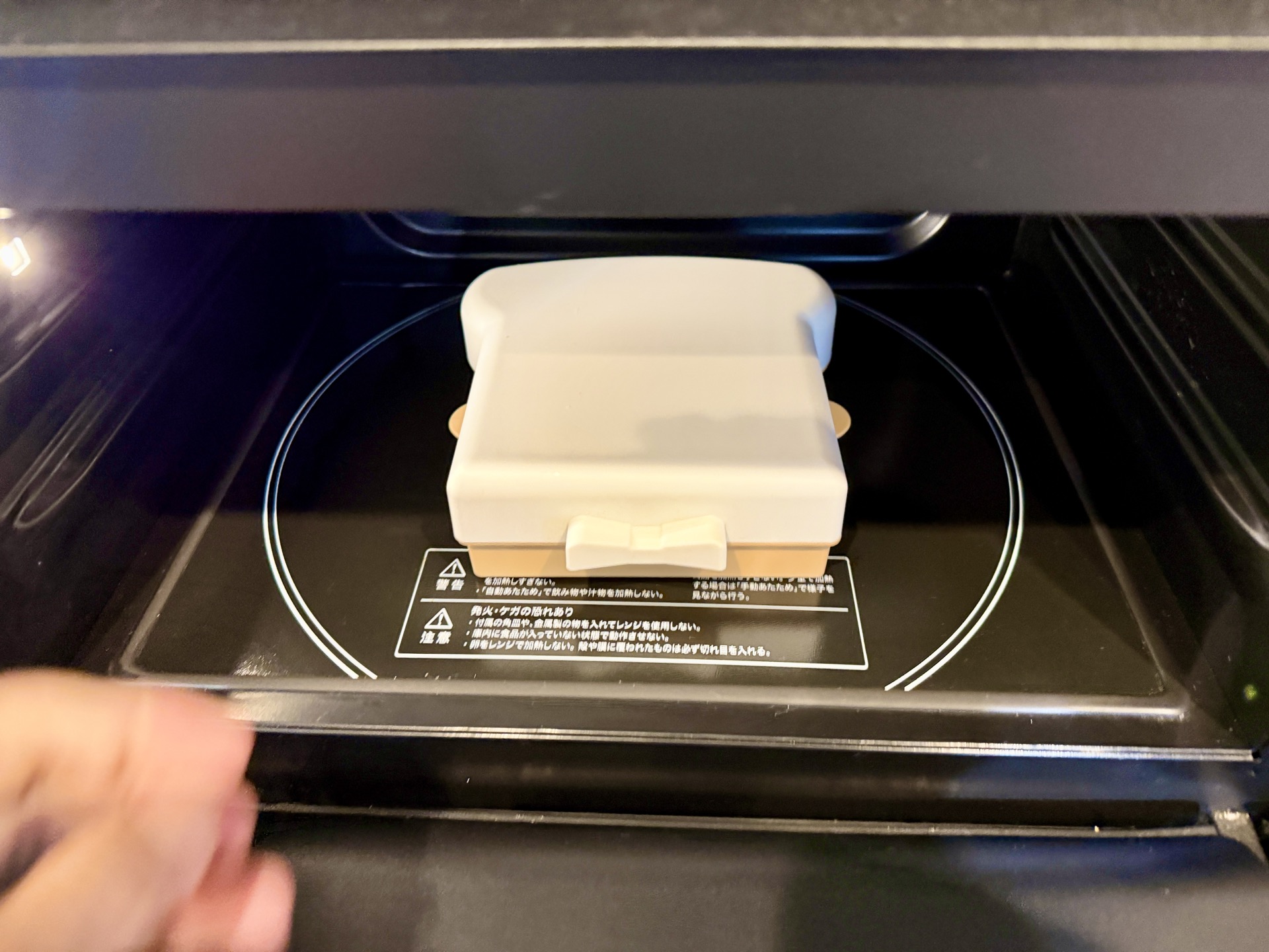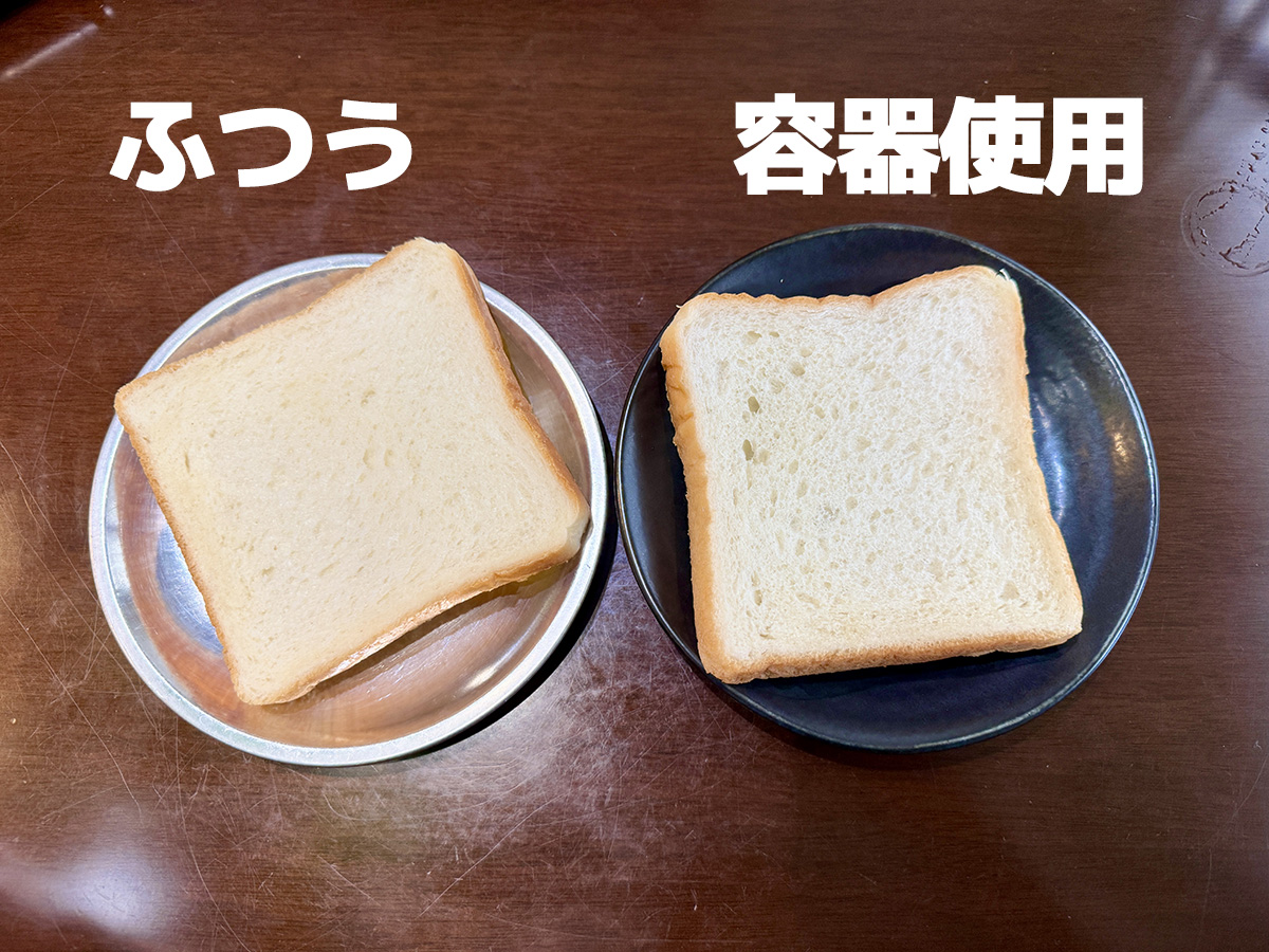 ということで、容器に小さじ1杯の水を入れ、市販の食パンをセット。500Wで30秒……あっという間だ。