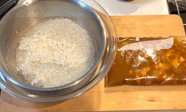 まず、バスマティライスを分量外の水で30分〜1時間ほど浸水して、全体が白くなったらザルにあげる。