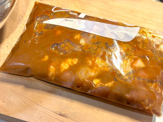 鶏もも肉をひとくち大にカットして、ビリヤニソースに30分〜1時間ほど漬け込む。