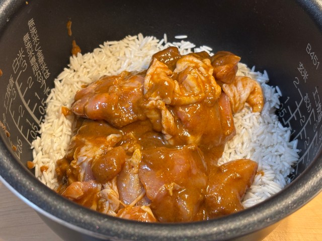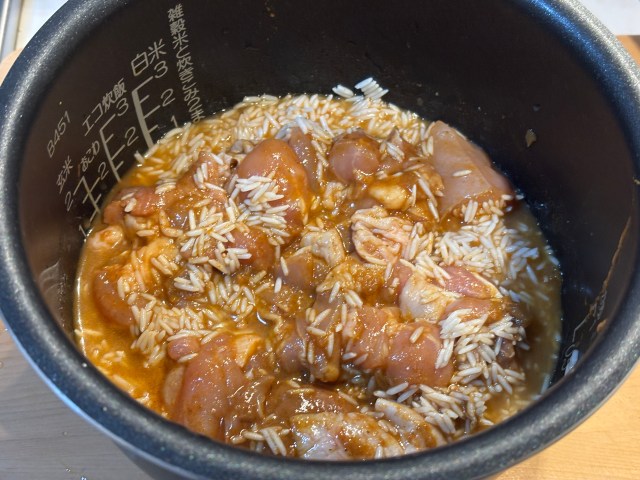 それが終わったら、50mlの水と一緒に炊飯器にバスマティライスと鶏肉をインして混ぜる。