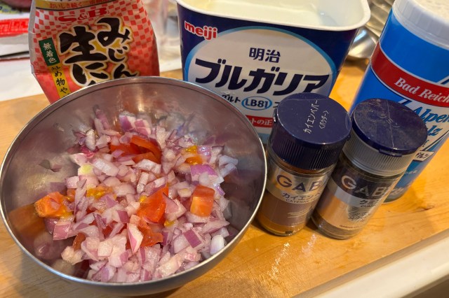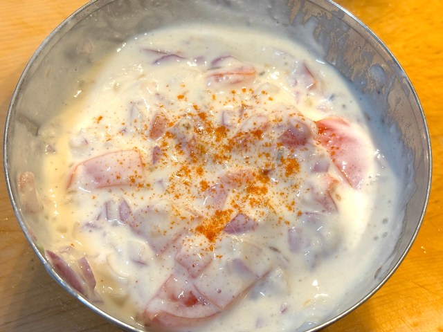 野菜をみじん切りにしてヨーグルトや他の調味料・クミンと混ぜる。カイエンペッパーを仕上げに少々ふる(かけすぎると辛くなるので少し)