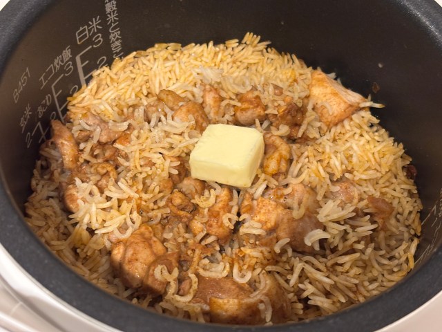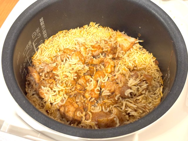 普通の米を炊くときよりかなり水が少なめなのでドキドキする。このとき、バスマティライスと具材がたいらになるように並べるのが重要なよう。通常モードの炊飯スイッチをオンして、あとは出来上がりを待つだけ!
