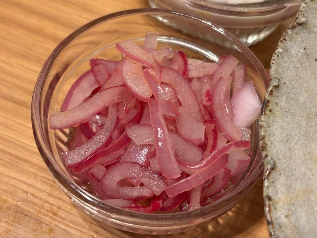 紫玉ねぎを薄さ2ミリくらいにスライスして、塩をもみ込んで15分くらい置く。紫玉ねぎをしっかり絞って水気を切ったら、その他の調味料・スパイスを混ぜる。時間が経つほうが味が馴染んでまろやかに。