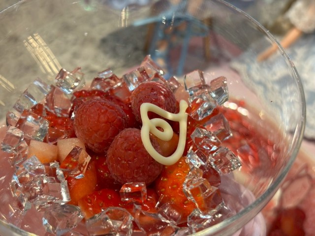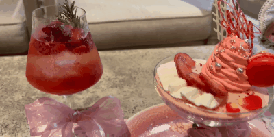 少しずつ、アフタヌーンティーを楽しんでいると、やってきたのが「LiccA ストロベリー&フラワーガーデンパフェ(3450円)」と「いちごジントニック ※ノンアルコール(1840円)」。