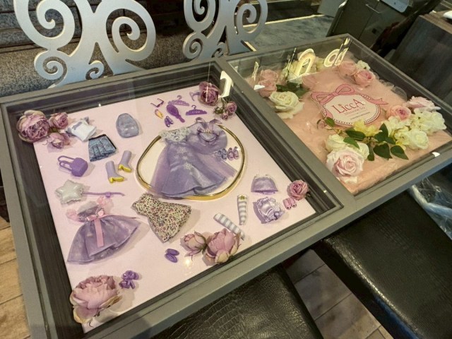 テーブルにはガラスボックスにドレスやアクセサリーが飾られている。いわゆる映え空間なのだが、ただ可愛いだけじゃなく、ちゃんとリカちゃんの世界観に寄せてきているのがポイントだ。
